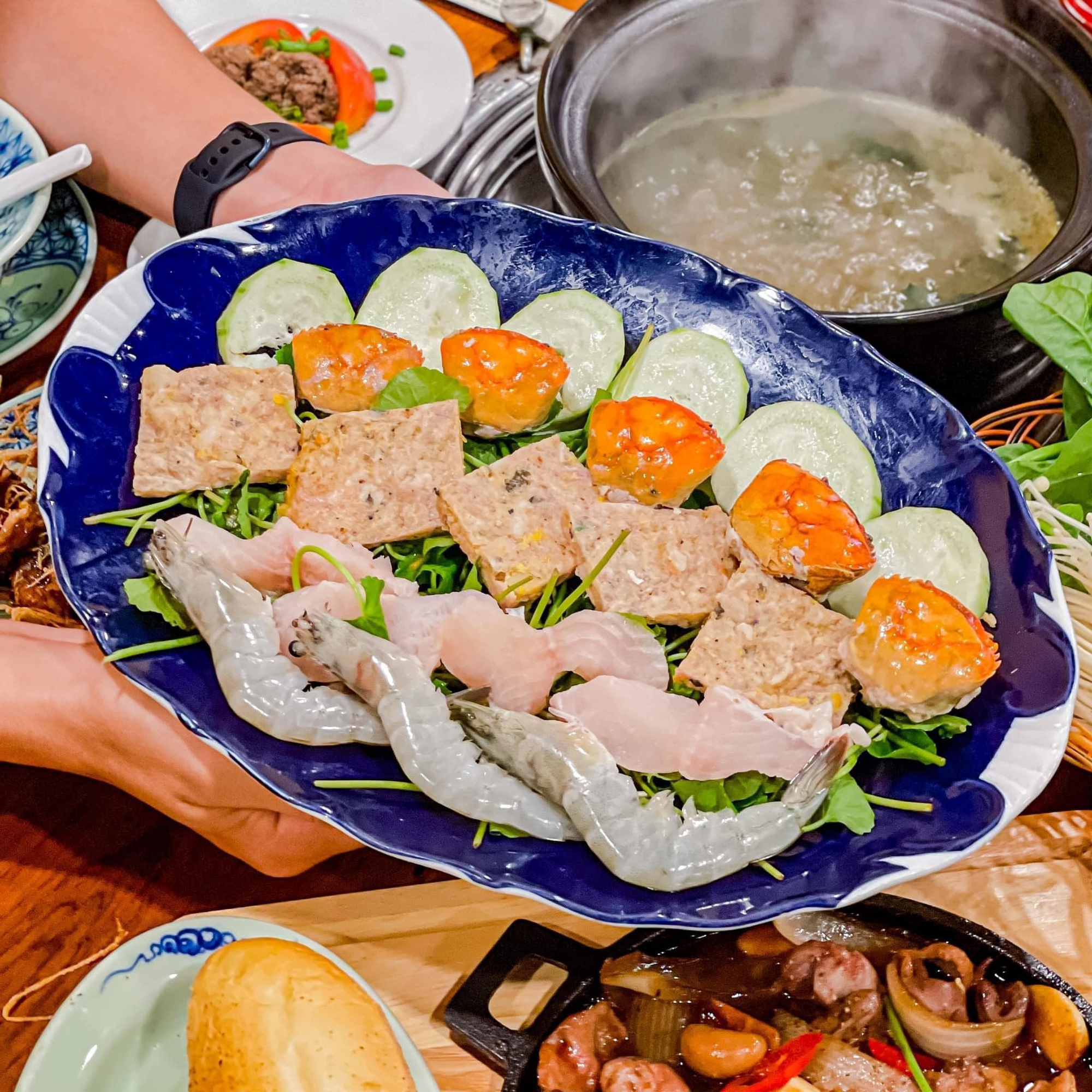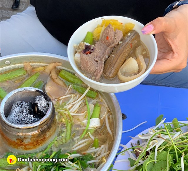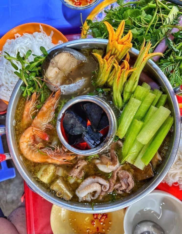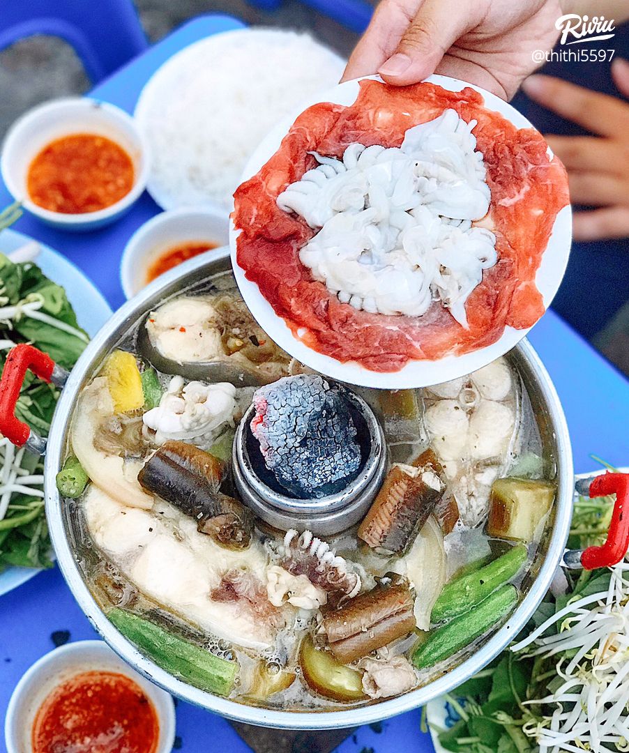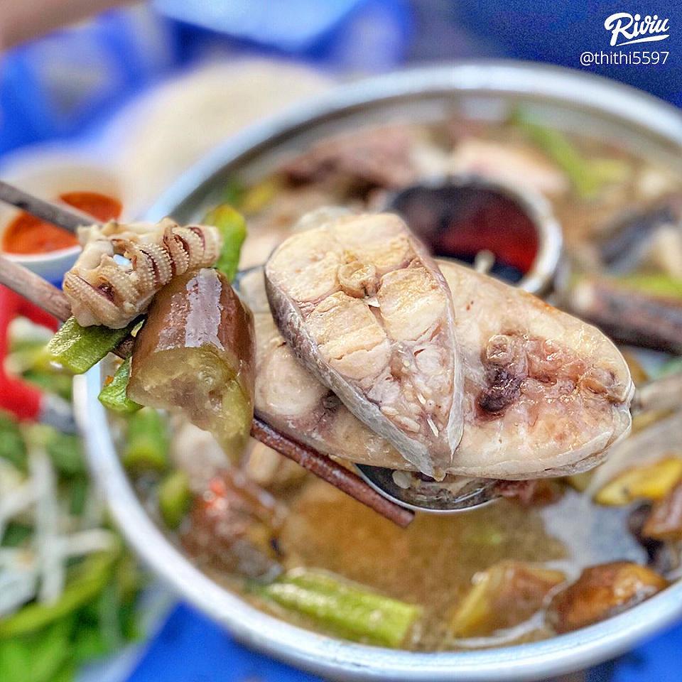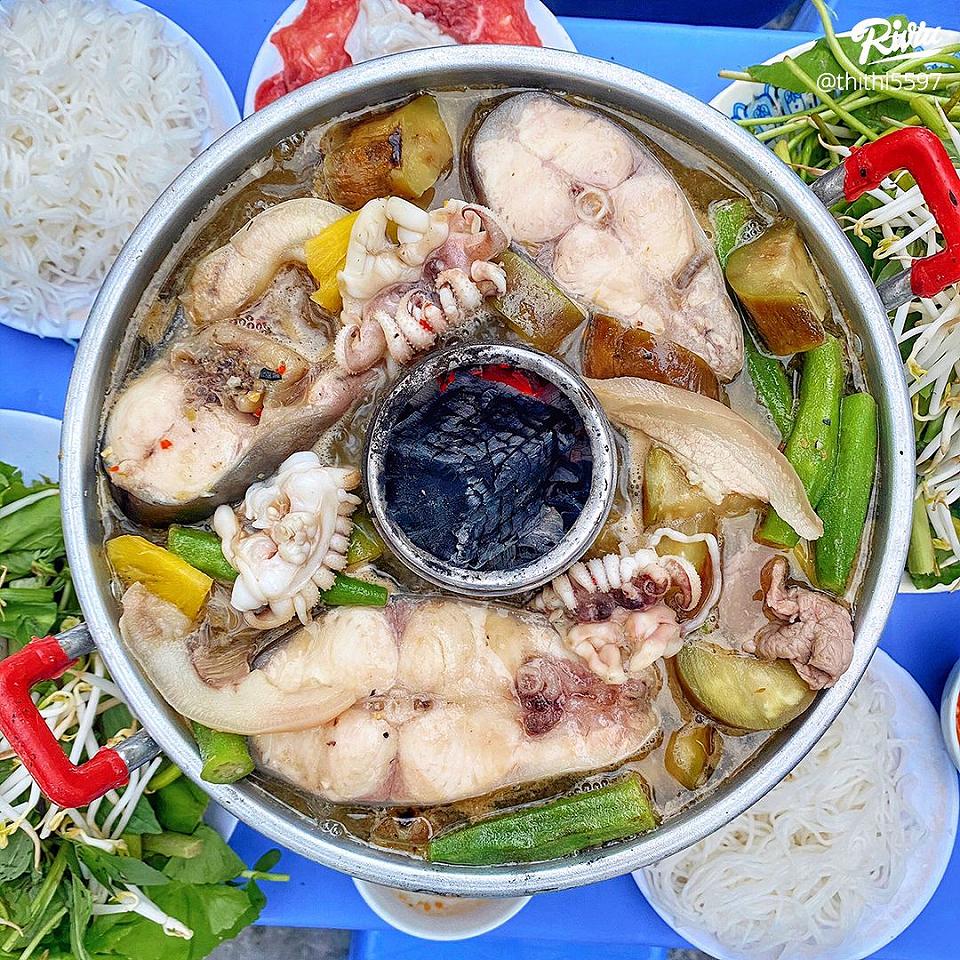 Lẩu ở đây cũng được đựng trong nồi dạng cù lao miền Tây đặc trưng. Trong set đồ đi kèm của lẩu thì đã có sẵn gần như cả con Cá Hú và khoảng 4,5 khúc lươn. Ngoài ra, còn có cả một đĩa đồ nhúng đầy ú ụ như: Mực, Bò, Thịt ba rọi, Bạch tuộc, Bún tươi, Rau má, Rau đắng, Kèo nèo, Giá, Cải bẹ xanh. Nước lẩu ở đây cực thơm mùi sả, mùi mắm thì không quá nồng và mặn phù hợp với khẩu vị của nhiều thực khách. Đặc biệt, quán còn có nước mắm gừng kết hợp chấm lẩu là hết bài.