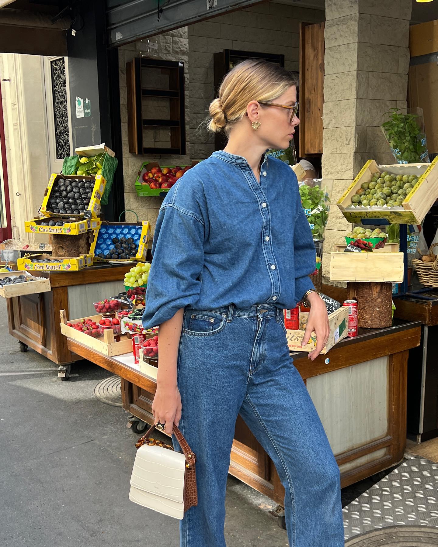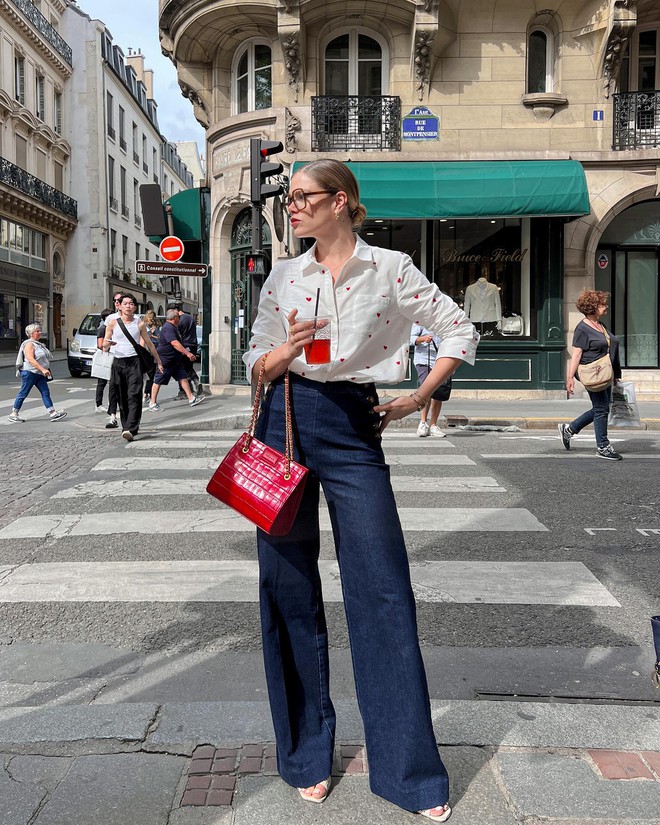 Áo sơ mi denim phảng phất nét cổ điển nhưng vẫn có sự trẻ trung, phóng khoáng. Do đó, muốn xây dựng phong cách mùa hè trẻ trung, chị em không nên bỏ qua mẫu áo này. Phụ nữ Pháp thường kết hợp áo sơ mi denim với quần jeans. Công thức này gây ấn tượng ở sự cá tính, bụi bặm, giúp vẻ ngoài của người diện thêm nổi bật. Để nâng tầm vẻ sang xịn mịn cho outfit, phụ nữ Pháp áp dụng những tuyệt chiêu như sơ vin gọn gàng, nhấn nhá trang sức vàng hoặc kính mắt.