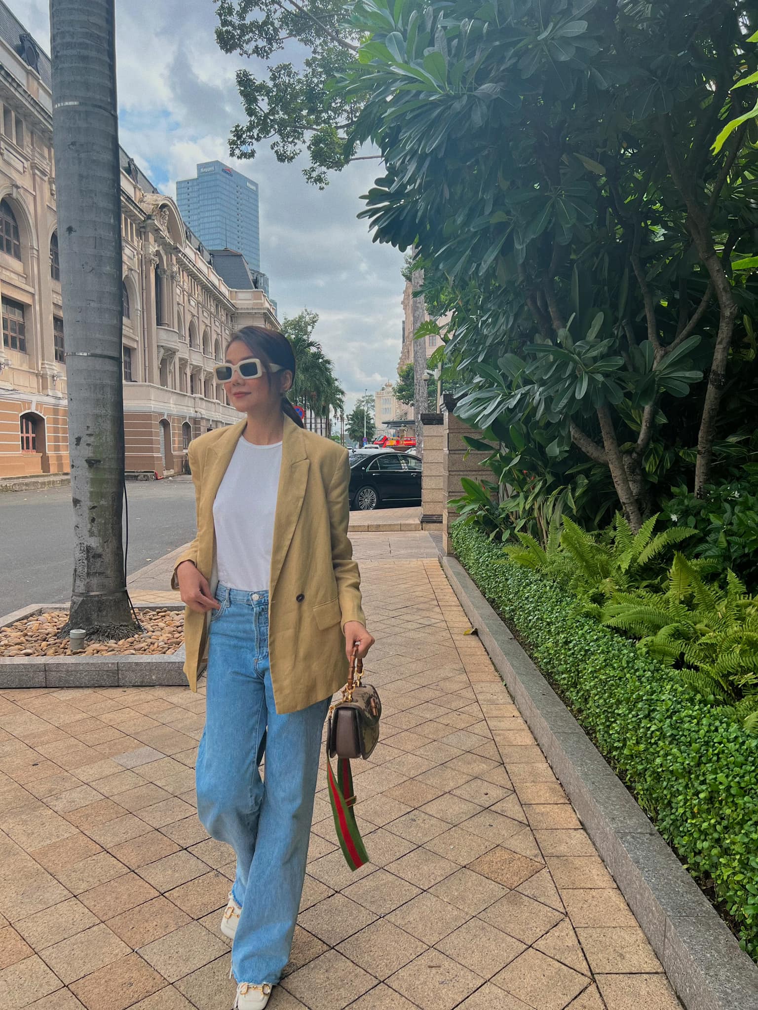 Khi diện quần jeans, Phạm Thanh Hằng thường chọn những kiểu giày như sneaker trắng, giày cao gót mũi nhọn, sandal dáng mule để hoàn thiện bộ trang phục sành điệu, tôn dáng hiệu quả.