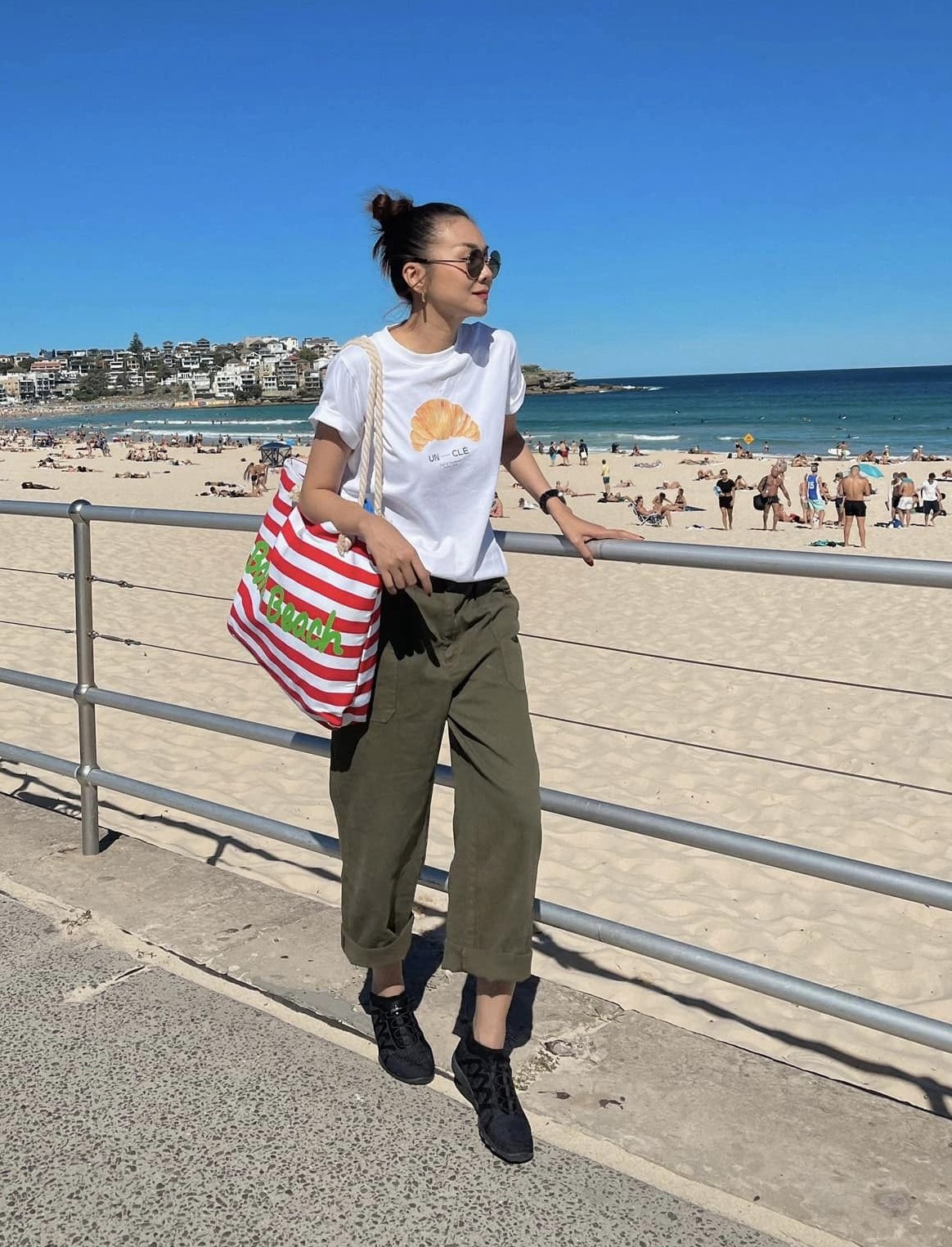Phạm Thanh Hằng thường kết hợp áo thun trắng trơn màu với quần jeans xanh, quần jeans trắng và khoác ngoài blazer, áo len quàng vai để tạo nên những bộ trang phục thanh lịch nhưng vẫn có điểm nhấn. Nổi bật hơn là sự kết hợp giữa áo thun trắng họa tiết, quần kaki và giày thể thao. Đây là gợi ý trang phục lý tưởng cho những chuyến du lịch.