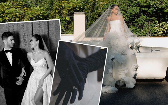 Nếu váy cưới đã khiến người xem choáng ngợp bởi độ tinh xảo, thì chi tiết "đắt giá" bậc nhất lại nằm ở bàn tay của Tiên Nguyễn nơi chiếc nhẫn đính hôn lấp lánh thu hút toàn bộ ánh nhìn. Dù không công bố thương hiệu, chỉ qua một khung hình cận, có thể nhận ra chiếc nhẫn định tình của Tiên Nguyễn đính viên kim cương cỡ lớn dạng round brilliant cut và được gắn trên một band nhẫn vàng trắng mảnh.