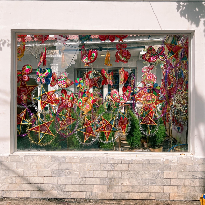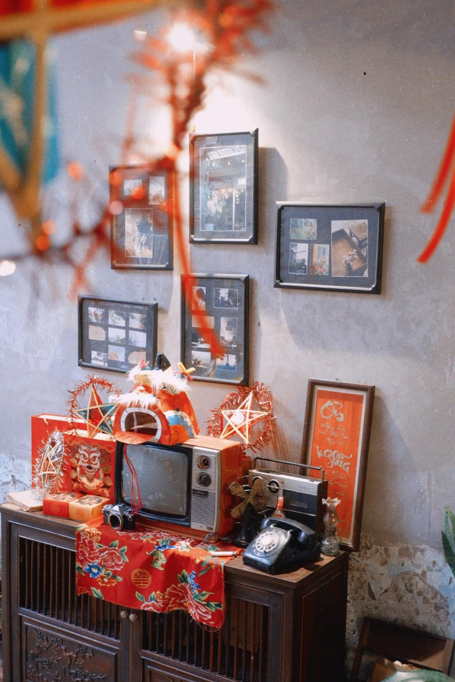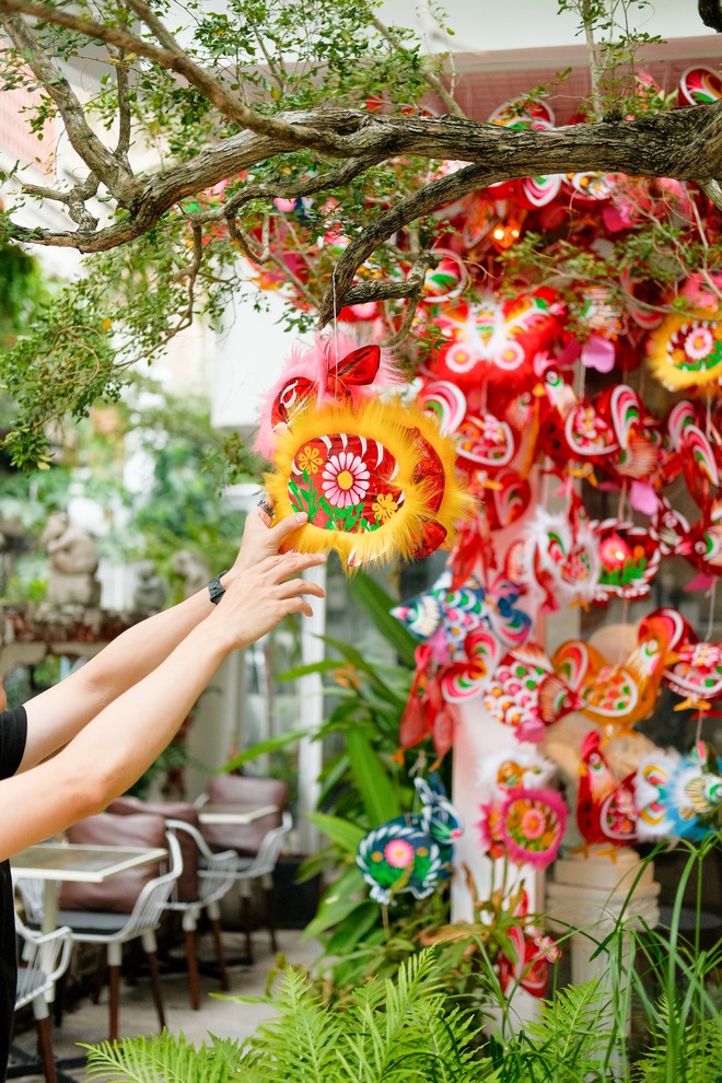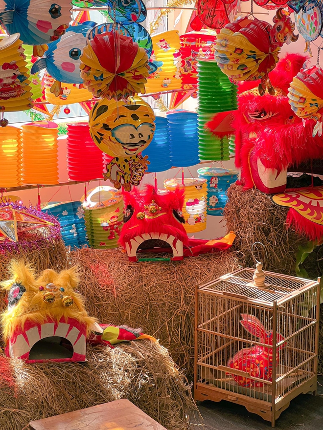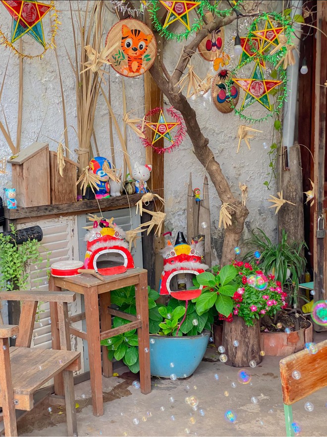 Ngoài "đặc sản" của quán mọi năm là chuẩn bị phông nền để các vị khách có thể thoả sức chụp choẹt. Thì năm nay quán lại đầu tư hẳn một góc để trưng bày những tò he, đầu lân, đèn ông sao đủ hình dạng để các vị khách có thể quay trở lại tuổi thơ của mình.