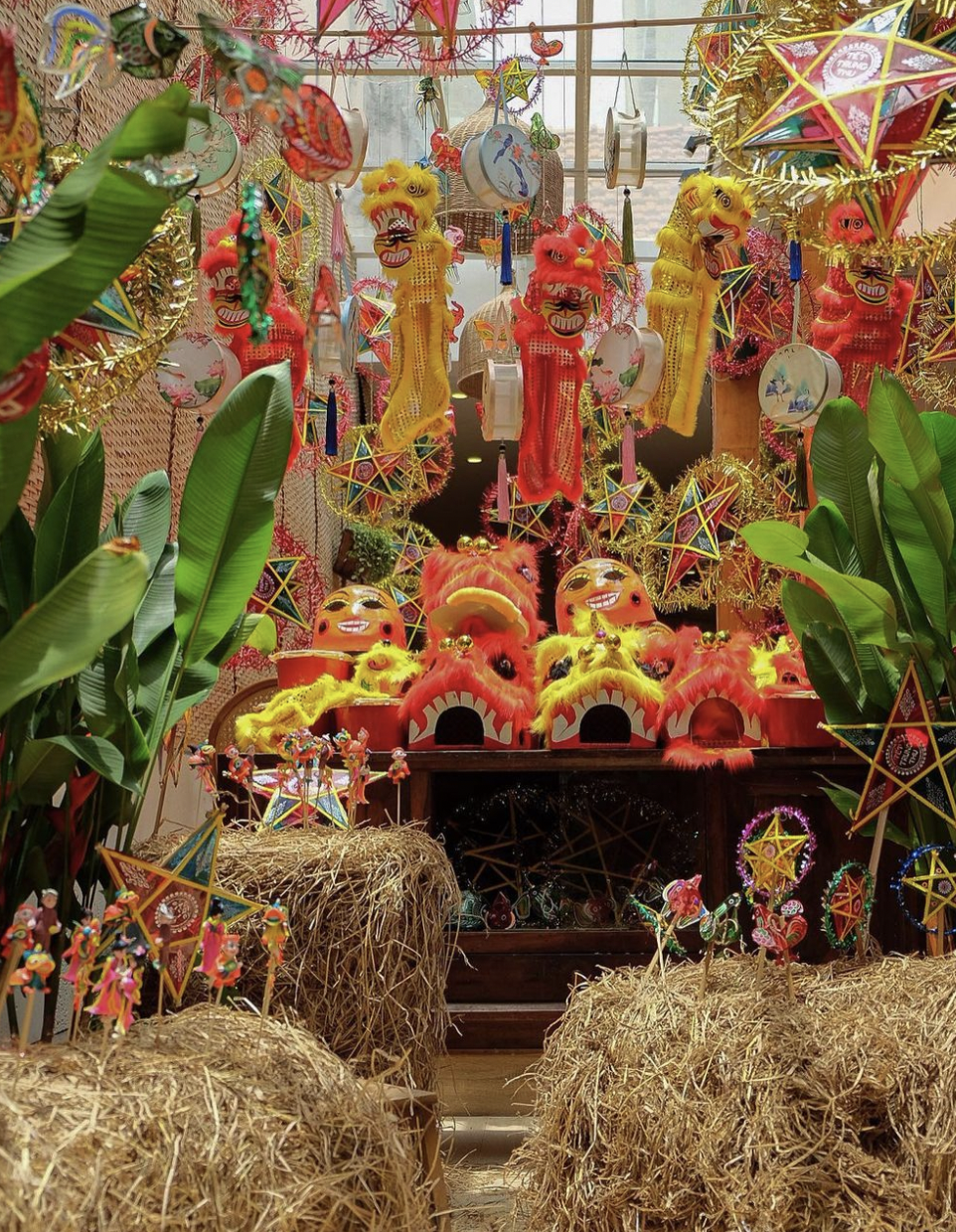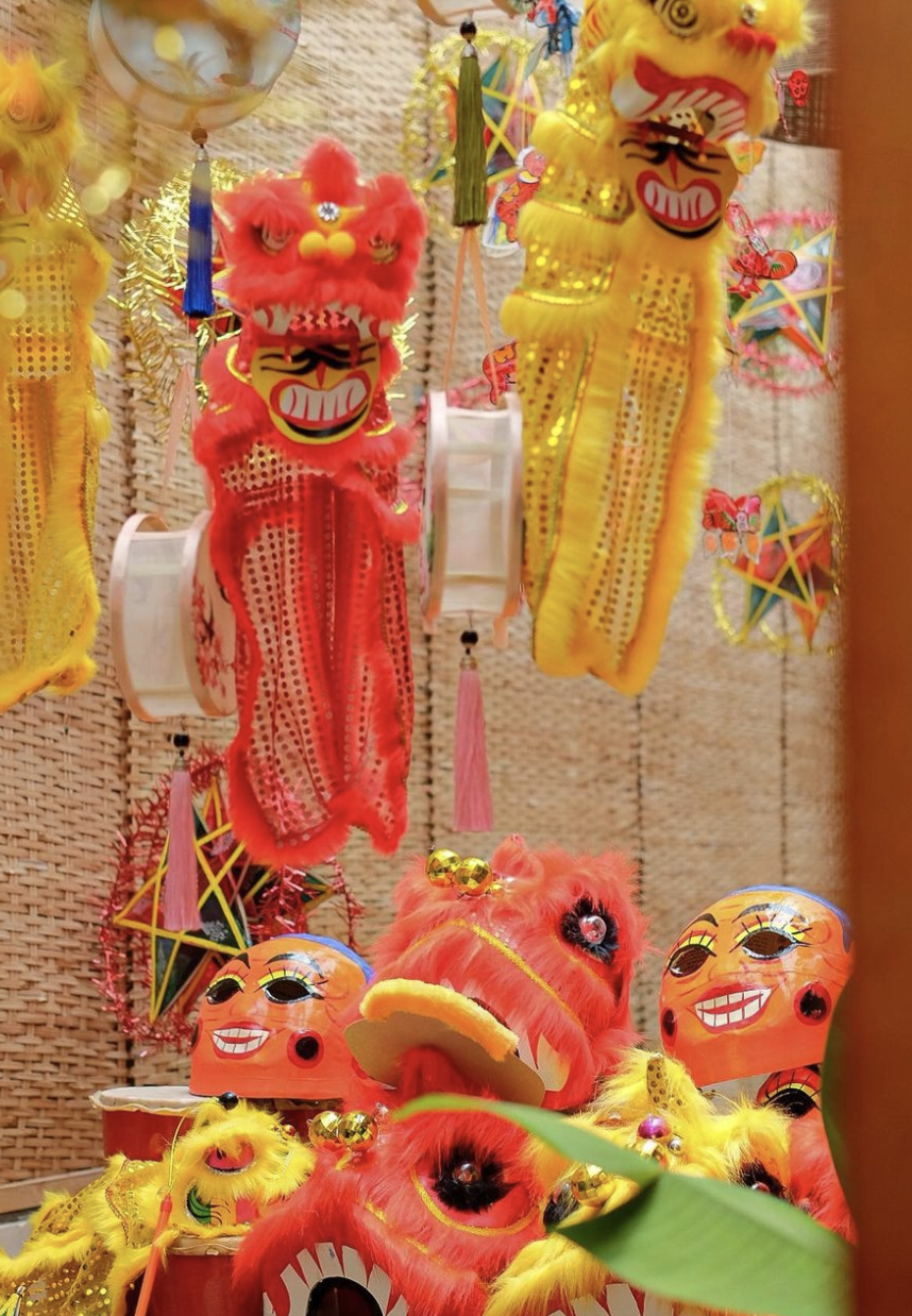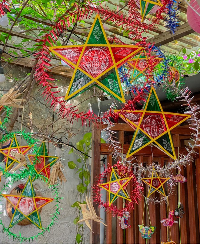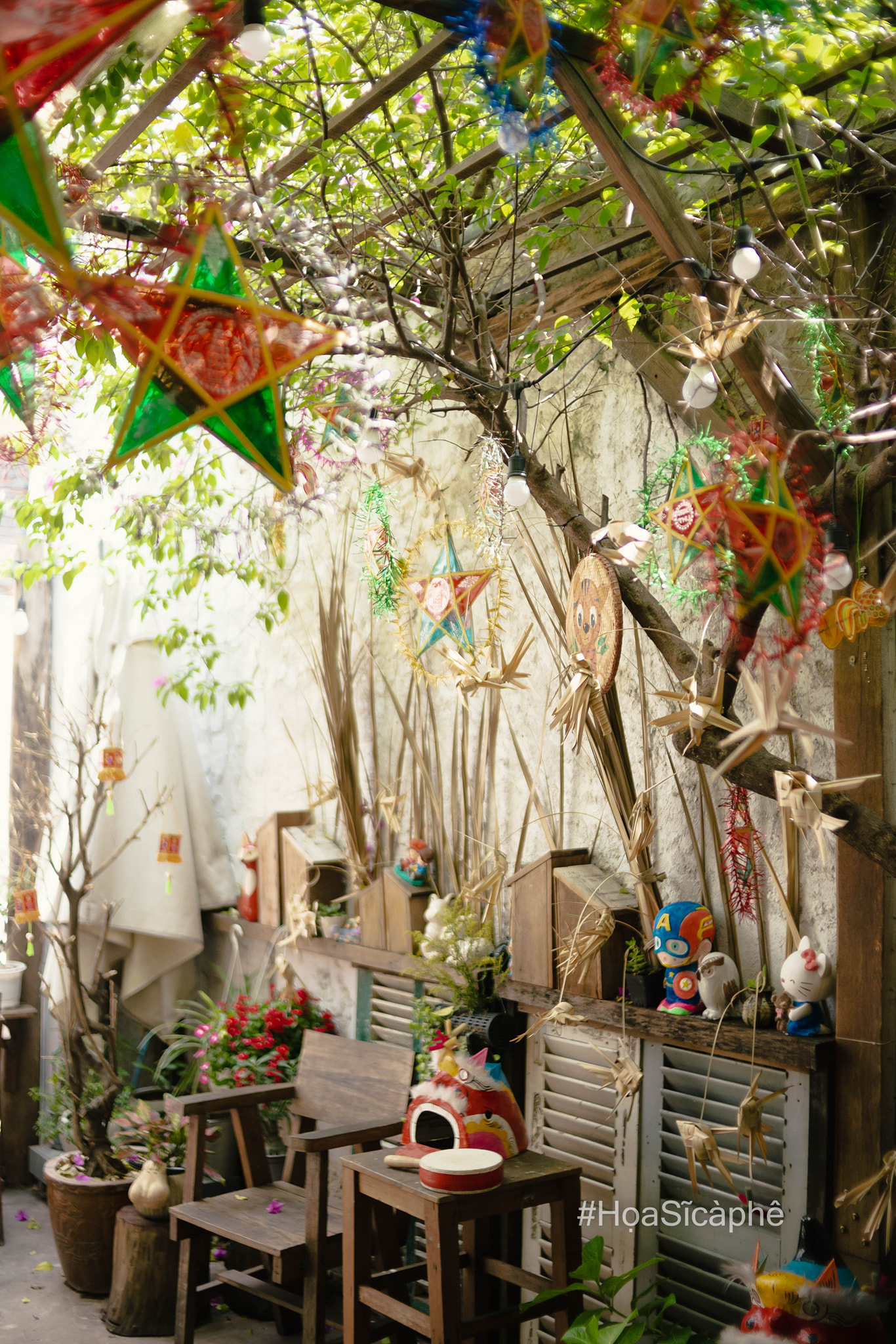 Ngoài "đặc sản" của quán mọi năm là chuẩn bị phông nền để các vị khách có thể thoả sức chụp choẹt. Thì năm nay quán lại đầu tư hẳn một góc để trưng bày những tò he, đầu lân, đèn ông sao đủ hình dạng để các vị khách có thể quay trở lại tuổi thơ của mình.