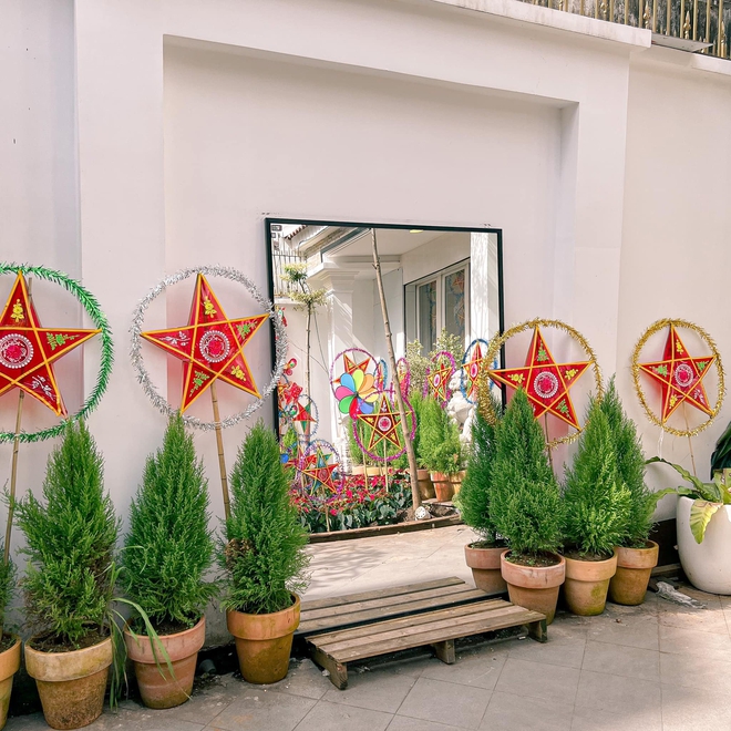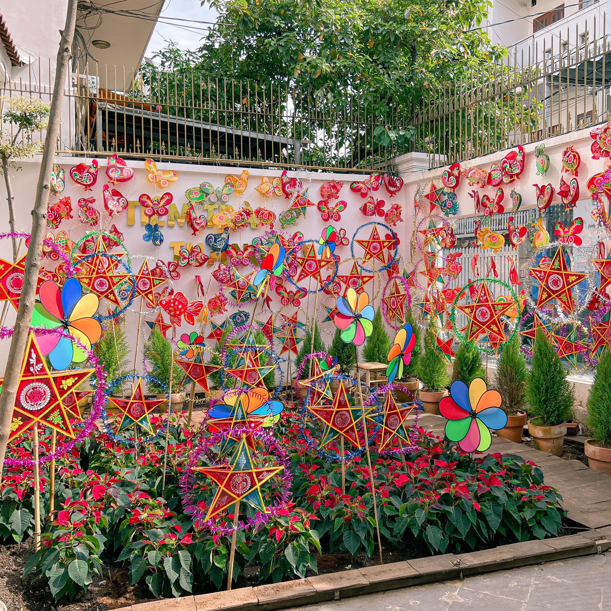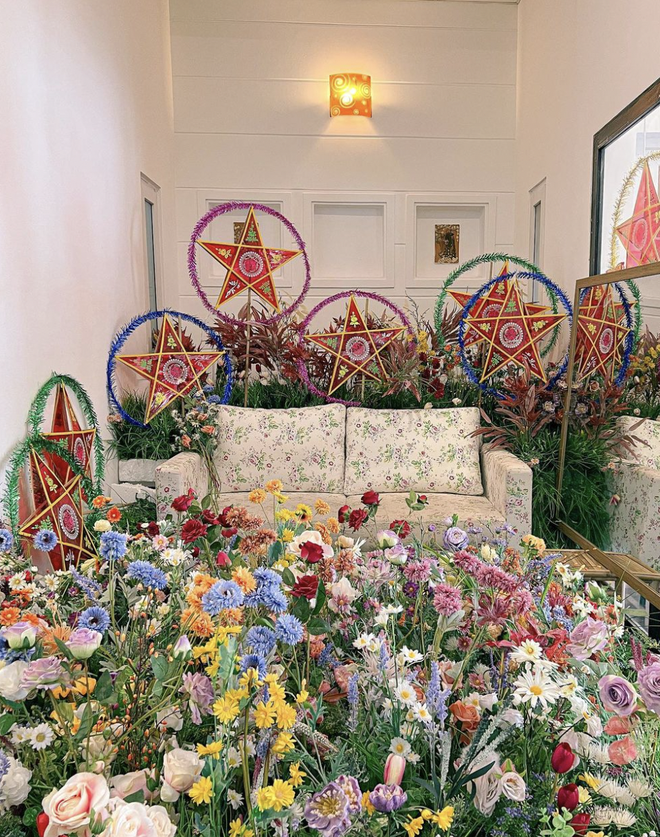 Không chỉ choáng ngợp bởi những "tấm màn" lồng đền ngay trước của với đủ thể loại, đủ sắc màu lung linh. Mà bên phía trong quán còn đặc biệt chuẩn bị cho hội đam mê "sống ảo" một khu vườn hoa nhiệm màu được trang trí lại theo phong cách trung thu, đầy sự độc đáo và mới mẻ cho những tấm hình dịp trăng rằm.