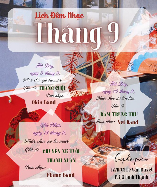 Ngoài không gian quán cà phê hoài niệm xinh xắn, mùa trung thu này quán còn chuẩn bị cho những vị khách chiếc đèn ông sao dễ thương khi đi từ 2 người. Và không để một đêm trung thu nhàm chán đến với bạn, Cà Phơ còn tổ chức đêm nhạc vào ngày trung thu để các vị khách có thể trải nghiệm cảm giác đón trăng nghe nhạc mới lạ.