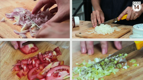 Thái nhỏ và băm nhuyễn hành tím, hành tây, gốc hành lá (phần gốc trắng của cây hành), cà chua thái hạt lựu.
