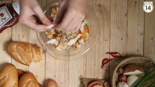 Bạn bóp hoặc xé vụn 1/3 ổ bánh mì rồi cho vào âu nguyên liệu. Bánh mì sẽ giúp món ăn ngon hơn và kết dính tốt hơn. Sau đó, trộn đều các nguyên liệu.