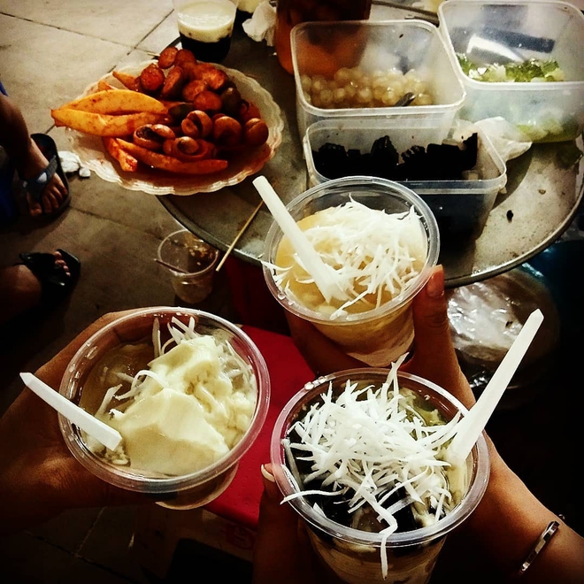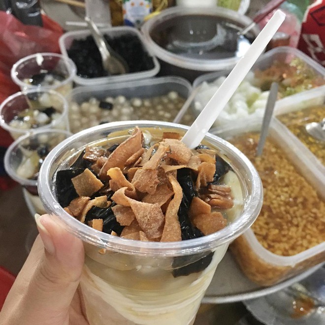 Một góc bên bậc thềm, lối vào cổng to của chợ Hà Đông là một hàng chè thập cẩm có phần cũ kỹ mà nếu như không nhìn kỹ, nhiều người sẽ bỏ qua vì tưởng chỉ bán trà đá. Ở đây cô chủ quán phục vụ những loại cơ bản nhất như chè đỗ xanh, đỗ đen, đậu đỏ, thêm topping là thạch đen, trân châu và dừa sợi.