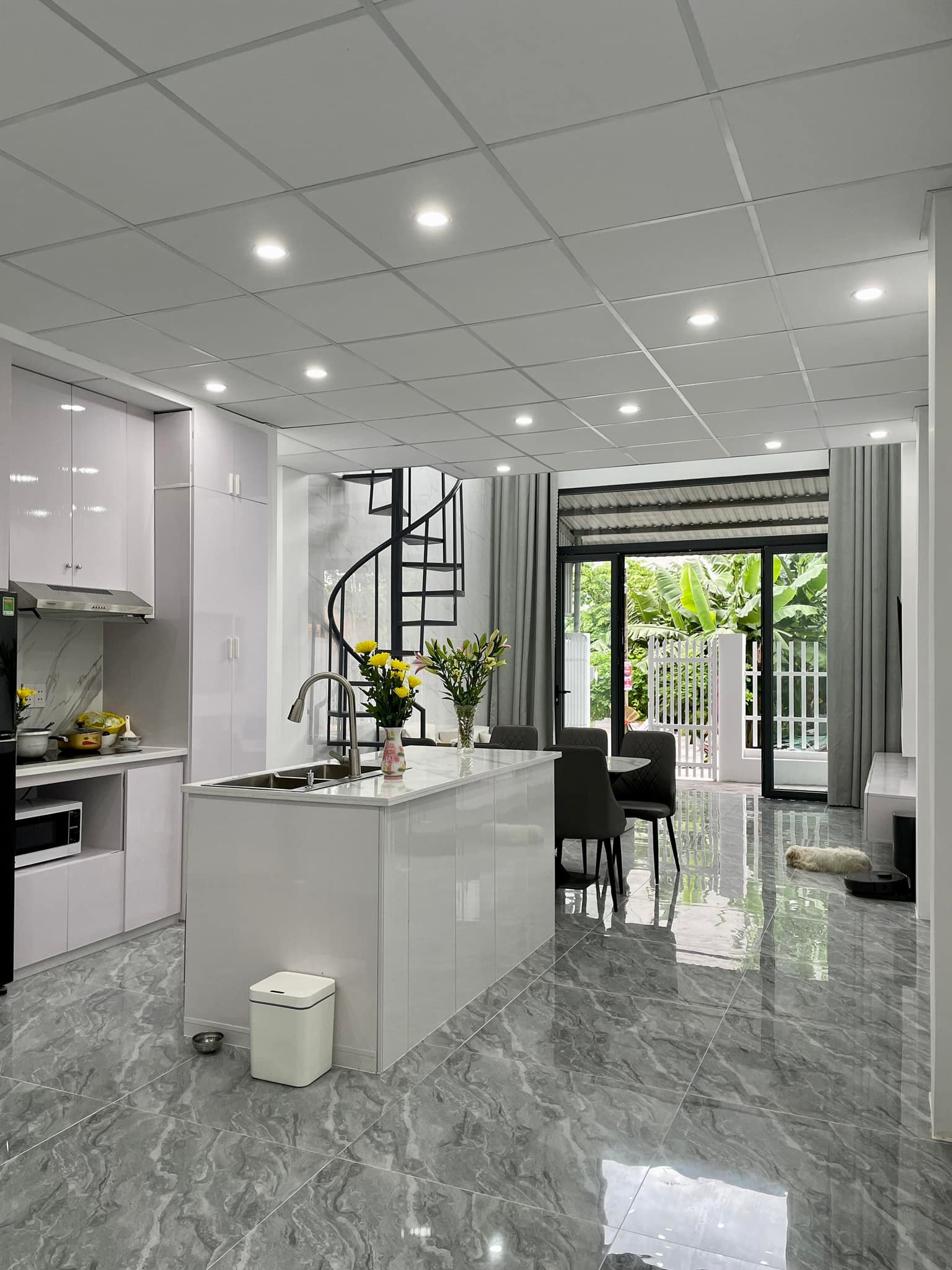 Từ phòng khách có thể thông xuống nhà bếp. Khu vực này được Phong thiết kế dựa trên nhu cầu sử dụng của gia đình. Theo đó, căn bếp không cần quá rộng mà chỉ cần nhỏ gọn, có đủ không gian để bố trí thêm 1 chiếc đảo bếp thật to ở giữa nhà. Thiết kế này vừa có thêm chỗ chứa, vừa có chỗ để những món ăn mẹ nấu. Căn nhà cấp 4 cũ còn có 1 sân sau được Phong tận dụng xây một chiếc nhà vệ sinh mới. Không gian này vẫn có giếng trời nhỏ để đảm bảo độ thông thoáng.