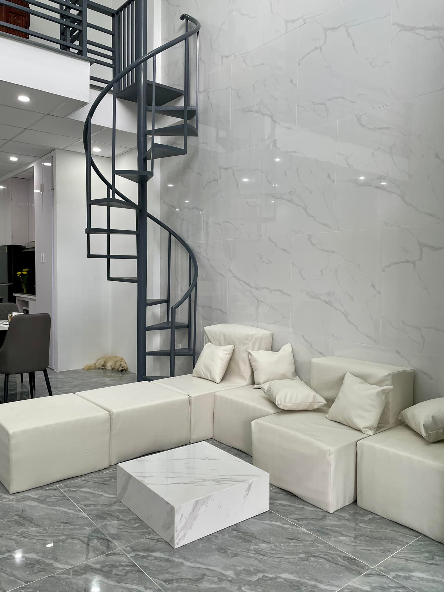 Trung tâm phòng khách được đặt một bộ sofa với kiểu dáng vuông vức tone-sur-tone với toàn bộ căn nhà. Phía sau sofa có cầu thang dẫn lên gác xép