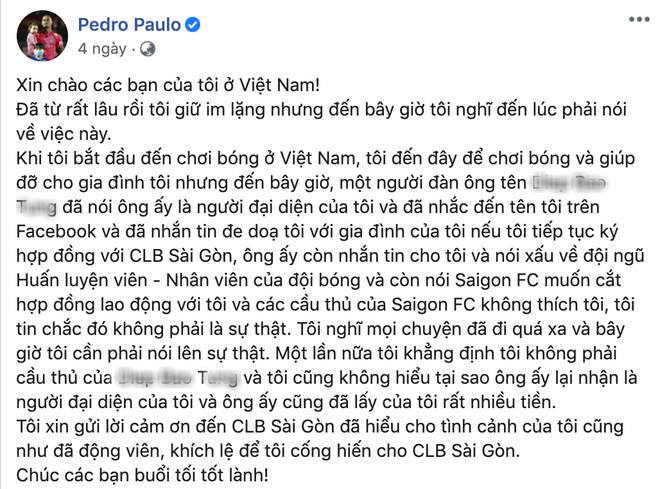 Vụ việc cười ra nước mắt kia chưa kịp lắng xuống thì từ đại bản doanh CLB Sài Gòn, thêm một đợt sóng mới cuộn trào khiến tất cả không khỏi bất ngờ. Ngoại binh đang chơi rất lên chân của đội bóng này, Pedro Paulo gây sốc khi đăng đàn tố cáo một người đàn ông tên D.B.T.