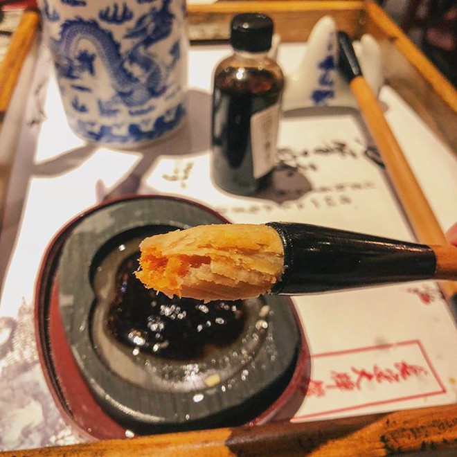 Bạn có thể vừa ăn vừa "viết thư pháp" với chiếc bút lông mềm mại và thơm tho được làm bằng bánh xốp. Thú vị nhất là khi nhúng trong phần sốt "trá hình" trong vẻ ngoài của một nghiên mực đen cứ như đang được làm một ông đồ vẽ chữ.
