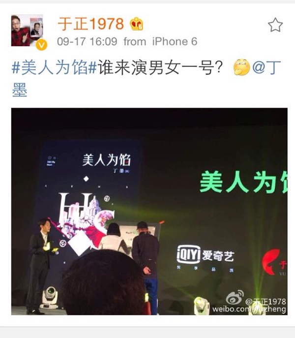 Qua tài khoản Weibo cá nhân, Vu Chính viết: “Hôm nay tôi đã hẹn gặp người đó, Hàn Trầm trong lòng các bạn. Thần thái cùng khí chất của anh ấy chỉ thích hợp để đóng vai nam chính mà thôi. Các bạn hỏi tôi anh ấy là ai ư? Chính là người mà các bạn thường nhắc đến trên weibo của tôi. Thế nhưng phải chờ anh ấy đọc xong tiểu thuyết mới quyết định được”. Ngay sau đó, Vu Chính đăng tải ảnh cùng Cận Đông, ám chỉ ứng viên được mình nhắc tới trong status chính là nam diễn viên sinh năm 1976 này.