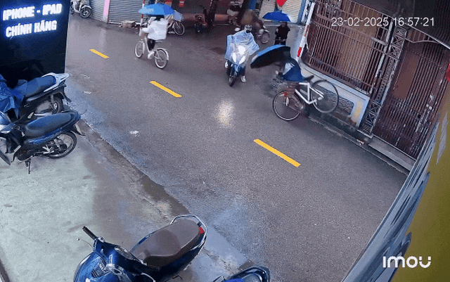 Từ đoạn video, có thể thấy do trời mưa, một bé gái đang vừa cầm ô vừa đạp xe trên đường. Đến khúc cua, có người điều khiển xe máy từ phía trong đi ra. Tình huống bất ngờ khiến bé gái không kịp điều khiển tay lái do đang cầm ô, nhấn phanh gấp khiến cả người và xe ngã đổ về phía trước.