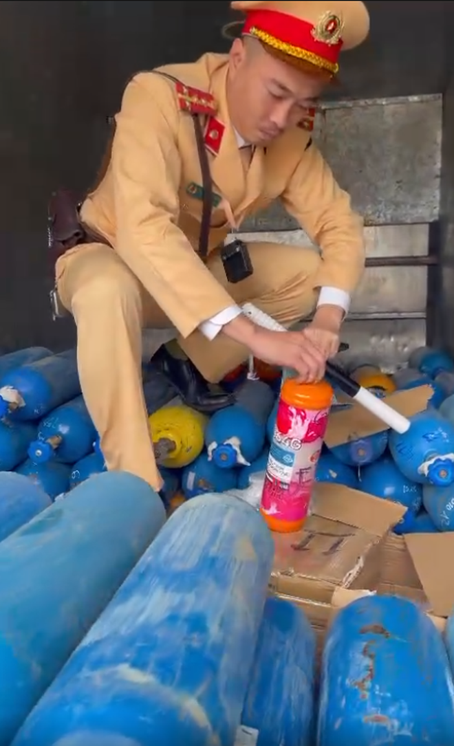 Thời điểm kiểm tra, lực lượng chức năng phát hiện trên xe chở 155 bình kim loại chuyên dụng chứa khí, nghi là khí cười, trong đó 30 bình vẫn còn khí.