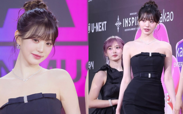 Jang Wonyoung nổi bần bật ngay khi vừa xuất hiện với tạo hình xinh như búp bê trong mẫu váy cúp ngực ôm sát màu đen, khoe trọn vóc dáng thon gọn, xương quai xanh quyến rũ đến đường cong hút mắt. Cô nàng lựa chọn kiểu tóc búi cùng trang sức đi kèm để diện mạo thêm phần yêu kiều, sang trọng và lấp lánh.