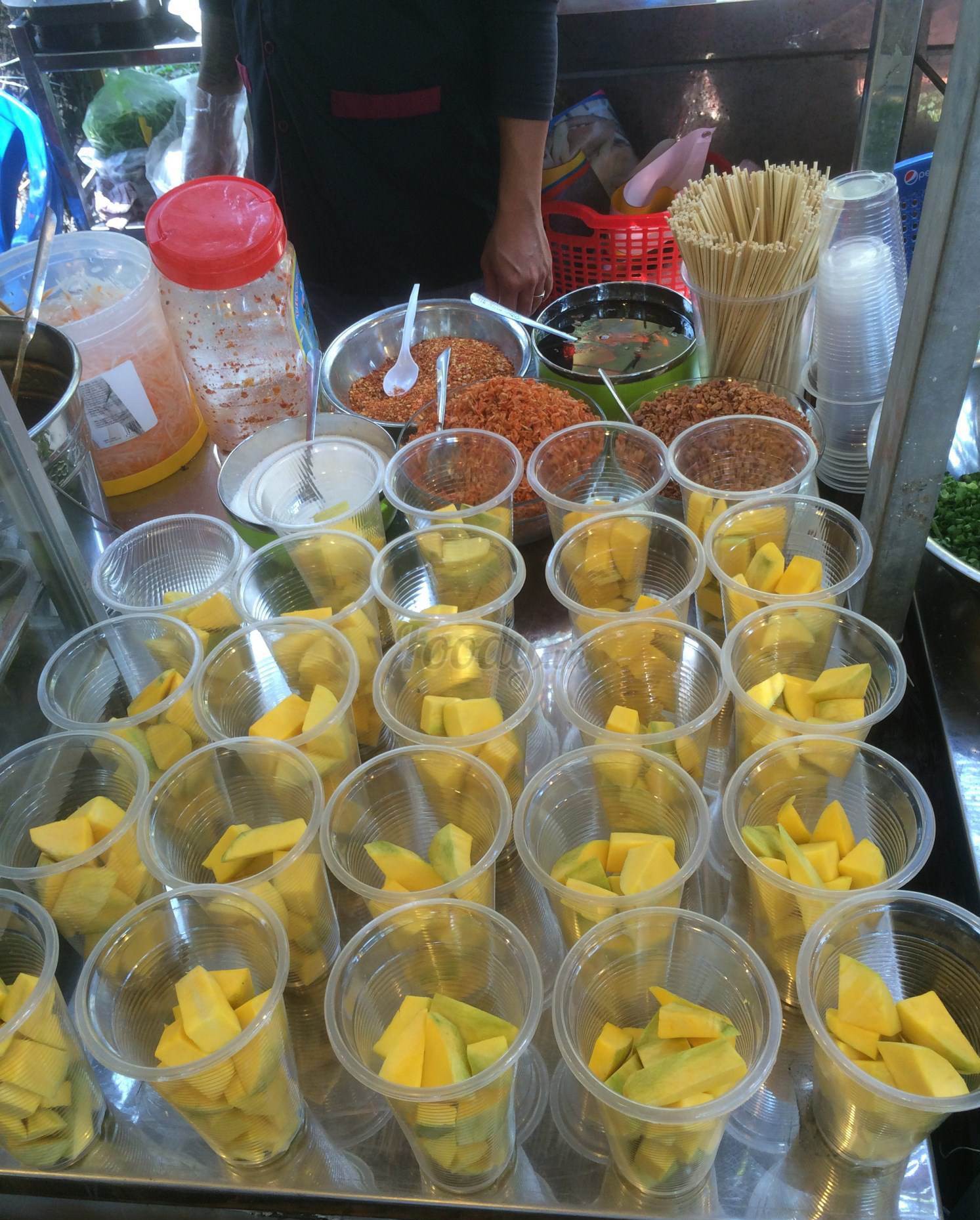 Bánh tráng khô được cắt sợi rồi trộn với các loại khô bò, khô mực, thêm một chút đậu phộng rang, rau răm thơm, xoài xanh bào nhuyễn, gia vị... rồi thêm sốt cho thấm mềm. Bánh tráng trộn có đủ vị ngọt, mặn, chua, cay nên chỉ nghĩ đến thôi là đã đủ ứa nước miếng rồi.