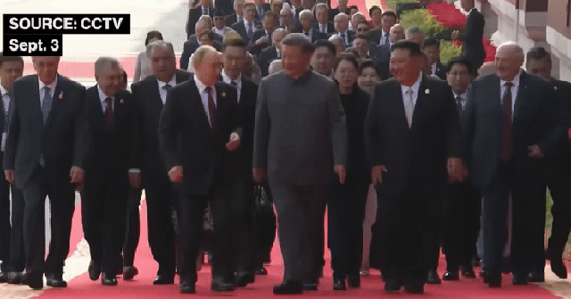 (Cuộc trao đổi giữa Tổng thống Nga Vladimir Putin và Chủ tịch Trung Quốc Tập Cận Bình được ghi lại vào ngày 3/9 khi hai ông cùng với hơn 20 nhà lãnh đạo các nước tiến vào lễ đài để dự lễ duyệt binh kỷ niệm 80 năm ngày chiến thắng phát xít tại Bắc Kinh, Trung Quốc. Nguồn: CCTV)