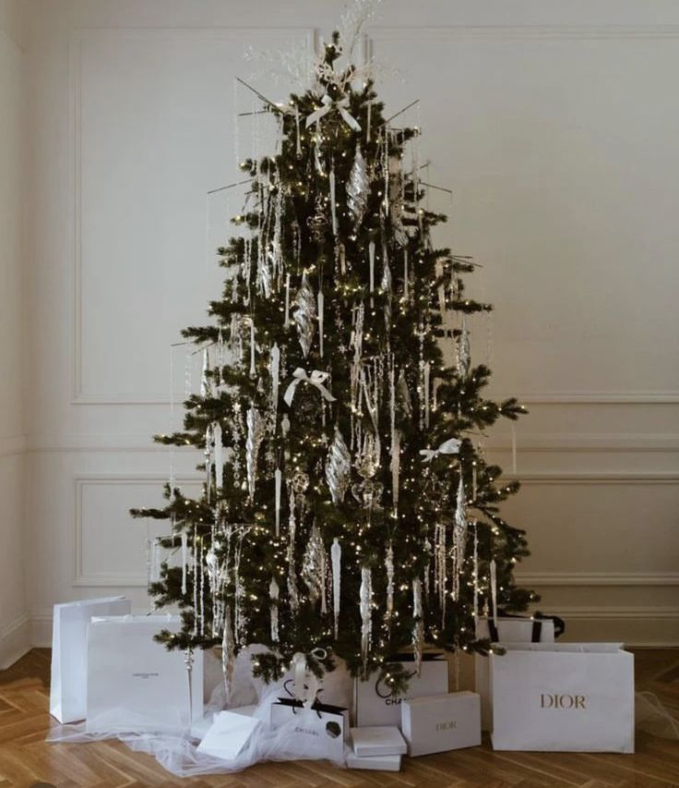 Mới đây nhất, Cô Em Trendy Khánh Linh cũng lựa chọn cách trang trí này cho cây thông cao 3 mét của mình. Tuy nhiên, thành phẩm của cô nàng nhận về nhiều ý kiến trái chiều từ cư dân mạng vì có phần rườm rà và rối mắt. Có thể thấy, cây thông của Khánh Linh được phủ rất nhiều dây kim tuyến bạc. Tuy nhiên, do những sợi dây này quá dày và dài nên đã che phủ toàn bộ tán lá, cành và dáng của cây. Và đây là lỗi sai chí mạng khiến "tác phẩm" của cô nàng khó có thể lấy lòng khán giả.