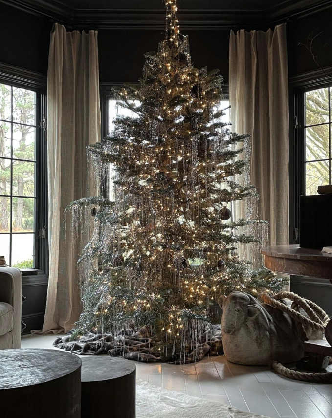 Những cây thông được phủ kim tuyến mang đậm hơi hướng vintage, tạo cho con người cảm giác hoài niệm về không khí Giáng sinh của nhiều năm về trước. Hiện tại, phong cách decor này vẫn được nhiều người lựa chọn để trang hoàng cây thông Noel của gia đình trong những dịp Giáng sinh.