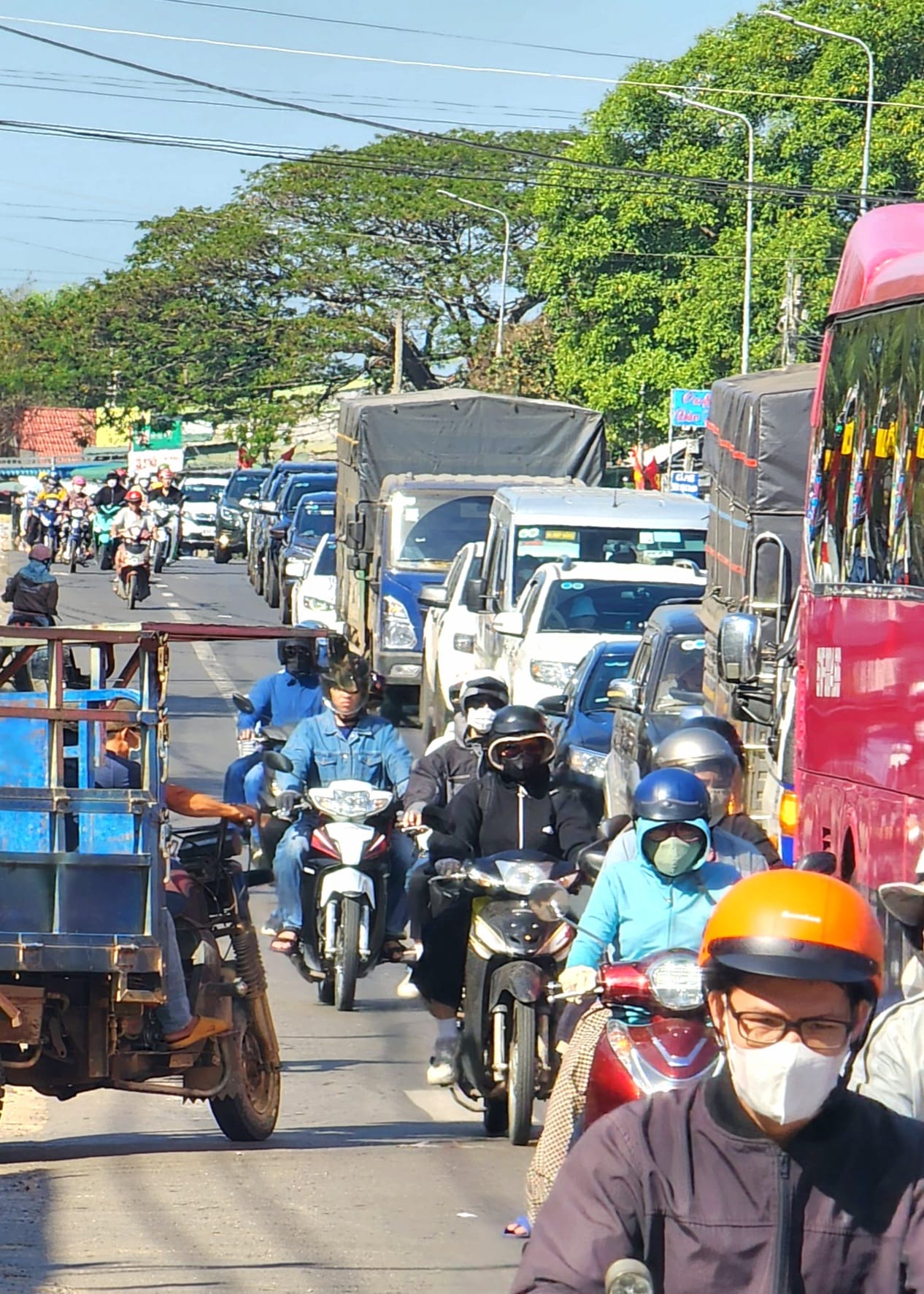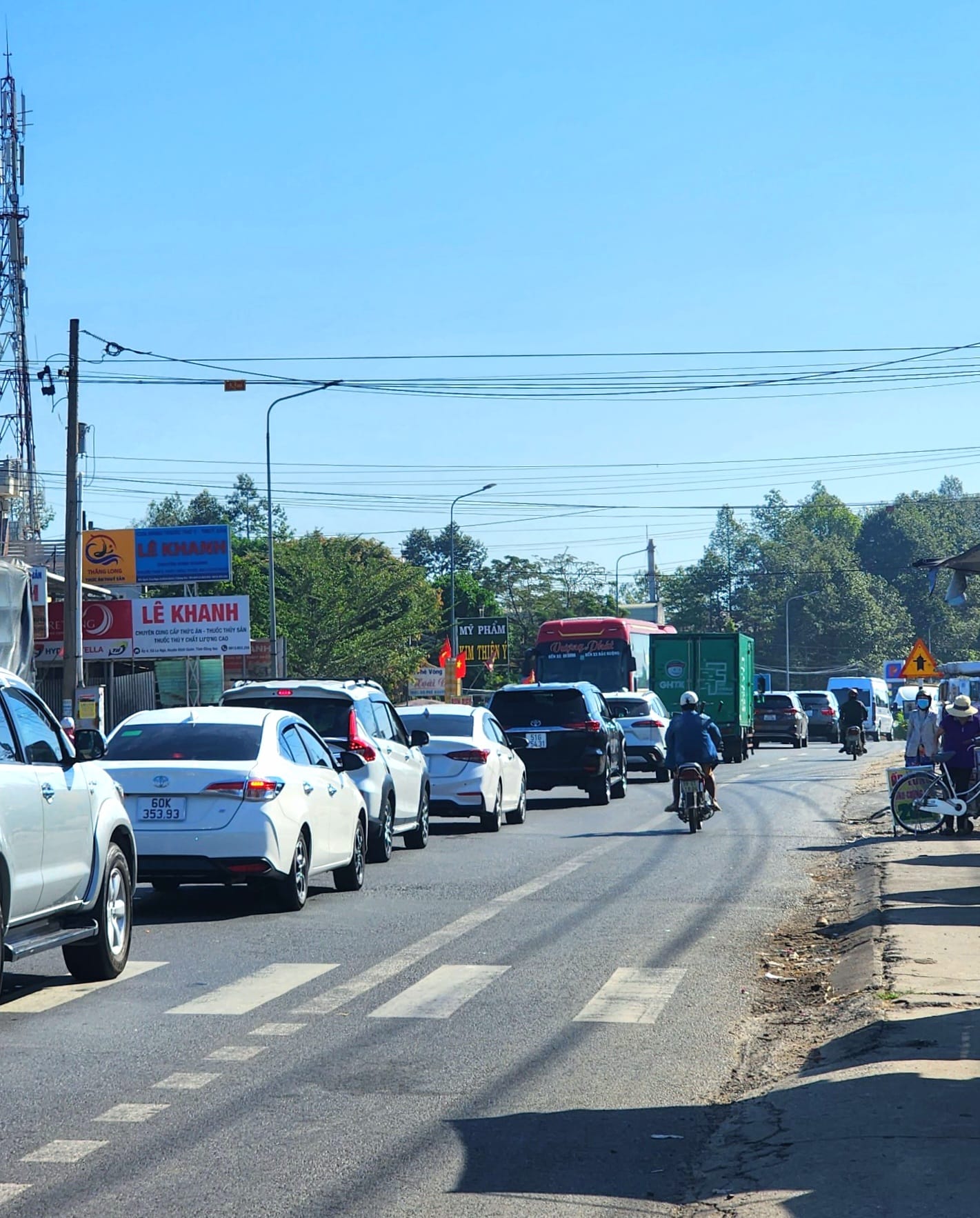 Chiều nay, đoạn đường quốc lộ 20 từ Đồng Nai hướng lên Đà Lạt đông nghịt người. Xe ô tô xếp hàng dài, một vài đoạn tắc nghẽn do du khách đang đổ lên Đà Lạt đông hơn hẳn.