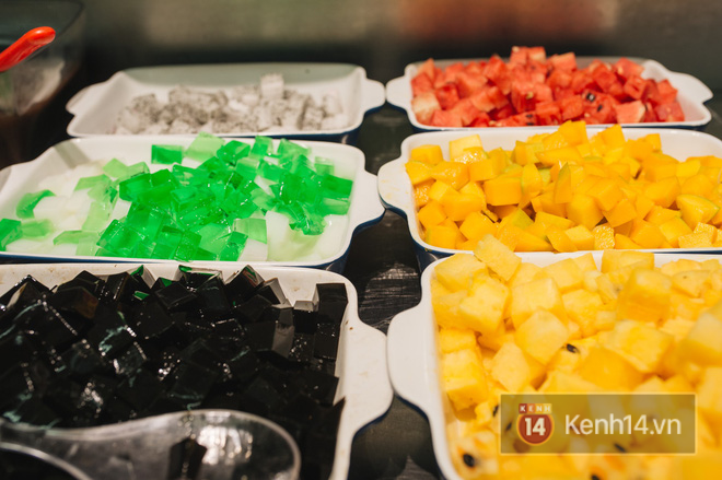 Điểm nhận dạng nổi bật nhất ở đây chính là xe hoa quả màu xanh ngay chính diện quán. Ở đây có rất nhiều loại hoa quả được chuẩn bị tùy theo mùa để bạn thỏa sức "múc". Từ đu đủ, dưa vàng, dưa hấu, bơ, dâu tây, kiwi, mít, nho, thạch, trân châu... muốn ăn gì thì múc. Sau đó, bạn có thể nhờ nhân viên rưới thêm sữa đặc hoặc nước cốt dừa lên trên là có thể mang ra thưởng thức.