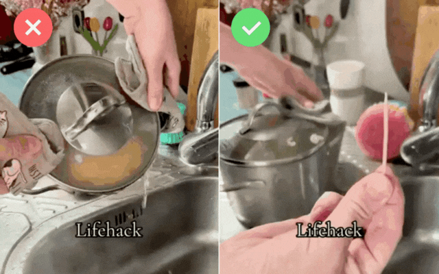 Theo hướng dẫn trong clip, khi đậy nắp nồi để chắt nước, bạn chỉ cần khéo léo kẹp một chiếc tăm nhỏ ở viền nắp. Tác dụng của chiếc tăm là tạo ra khe hở nhỏ, giúp nước thoát ra nhanh chóng mà nắp vẫn chắc chắn, không lo tuột tay hay sợi mì bị trôi theo. Đây quả là mẹo "nhỏ mà có võ", hội tụ đủ 3 tiêu chí: đơn giản - dễ làm - hiệu quả cao, bảo sao ai xem clip cũng tấm tắc khen hay.