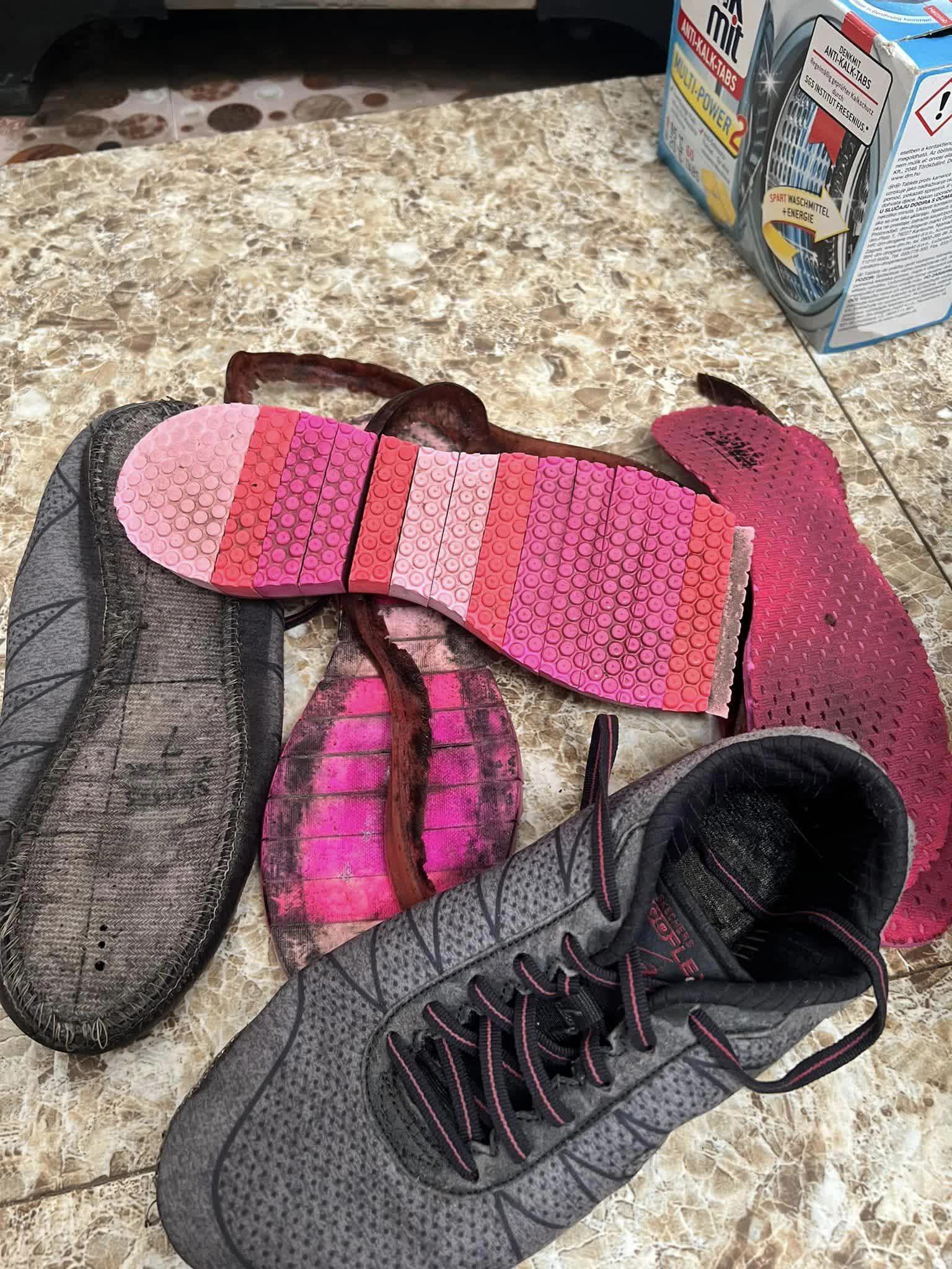 Theo chia sẻ, người này cho 3 đôi giày thể thao, 2 chiếc khăn lau chân và 3 viên tẩy lồng giặt vào máy, sau đó chọn chế độ giặt với nhiệt độ nước 60 độ C. Khoảng 40 - 50 phút sau, máy giặt có dấu hiệu rung lắc và phát ra âm thanh lớn khiến người này vô cùng hoảng hốt nên liền ấn nút tạm dừng. Kết quả là 3 đôi giày đều bị bong tróc bề mặt, hỏng phom và bung đế. Thấy vậy, gia chủ liền đăng bài phản ánh cho rằng cách làm này không hề hiệu quả.