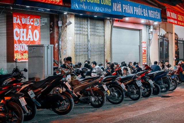 Khi những chiếc bóng đèn vừa thắp sáng là một số người đã dựng sẵn xe, chờ vào mở hàng những bát bún đầu tiên. Từ lúc đó, cô Quỳnh cứ luôn tay, hết sắp bún, xếp đồ, chan nước phục vụ các thực khách.