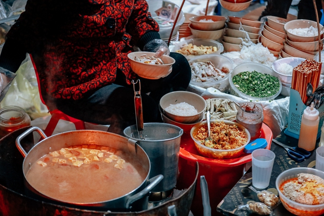 Ở các con phố quanh chợ Đồng Xuân, không khó tìm được các hàng quán bán bún riêu. Nhưng khiến ai nấy đi qua đều phải ngoái lại đầy nghi hoặc, chính là gánh bún ở phố Nguyễn Thiếp.