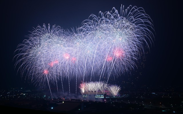 20h50, Tại SVĐ Mỹ Đình, ngay khi màn pháo hoa đầu tiên bừng sáng trên bầu trời, người dân đồng loạt hò reo, vỗ tay trong niềm hân hoan, phấn khởi.