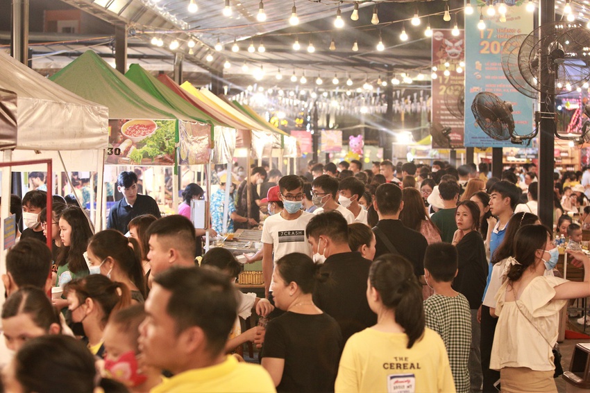 Du khách chen chúc đứng xếp hàng trước các quầy bán thức ăn. Các gian hàng bán đồ ăn uống phải phục vụ hết công suất.