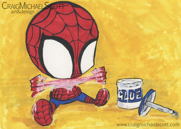 Thời thơ bé, Người Nhện có lẽ đôi lúc sẽ quên mất rằng tơ của mình có khả năng bám dính tốt nên cậu lấy hồ dán để bôi thêm vào, nhưng có vẻ đó không phải ý hay…