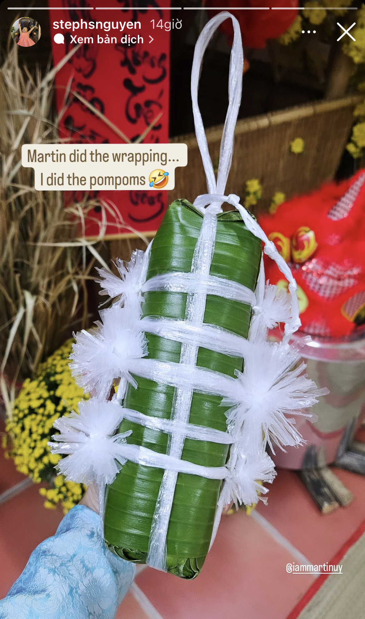 Tiên Nguyễn diện áo bà ba, hào hứng tham gia buổi gói bánh tét cùng gia đình