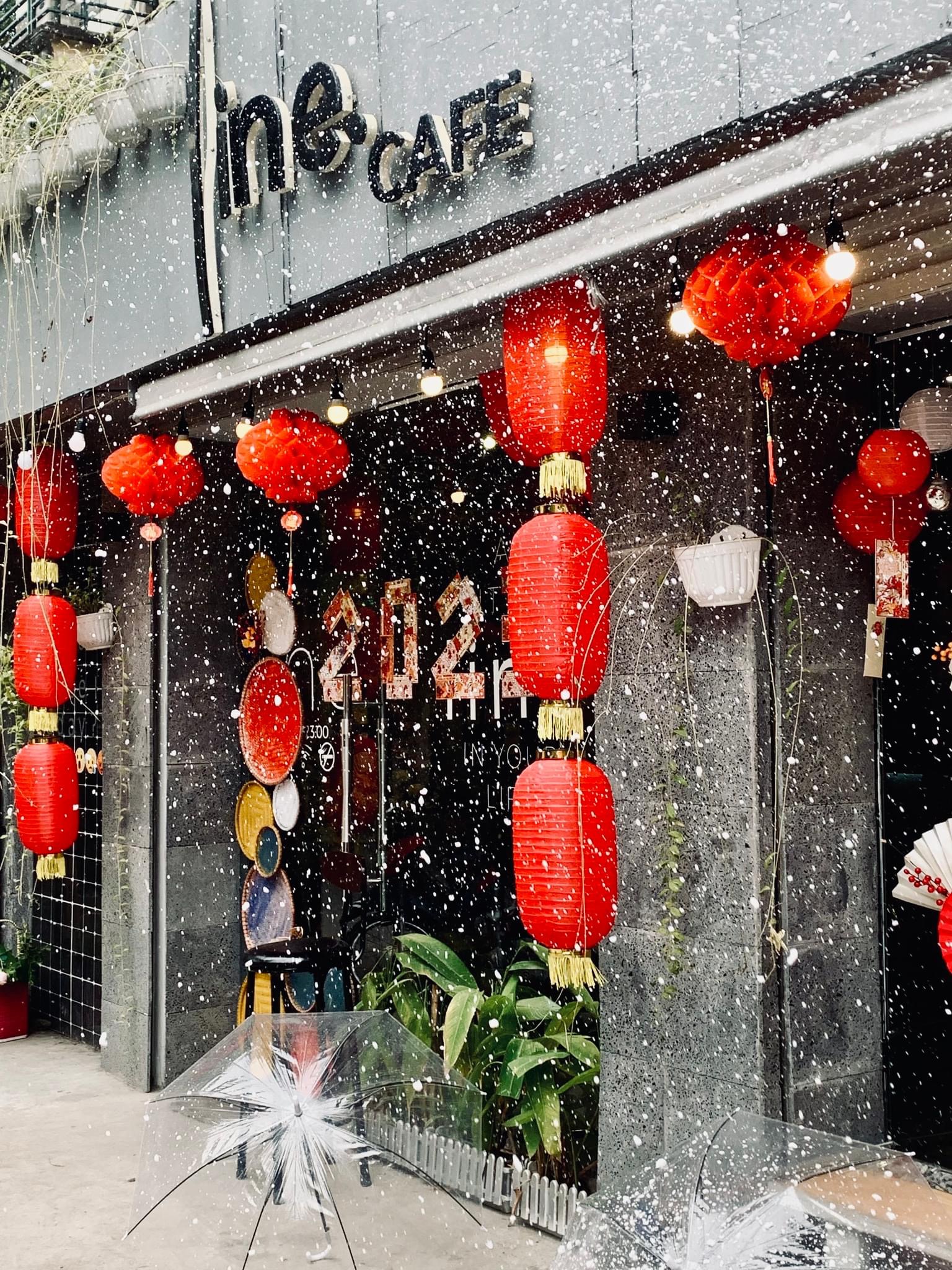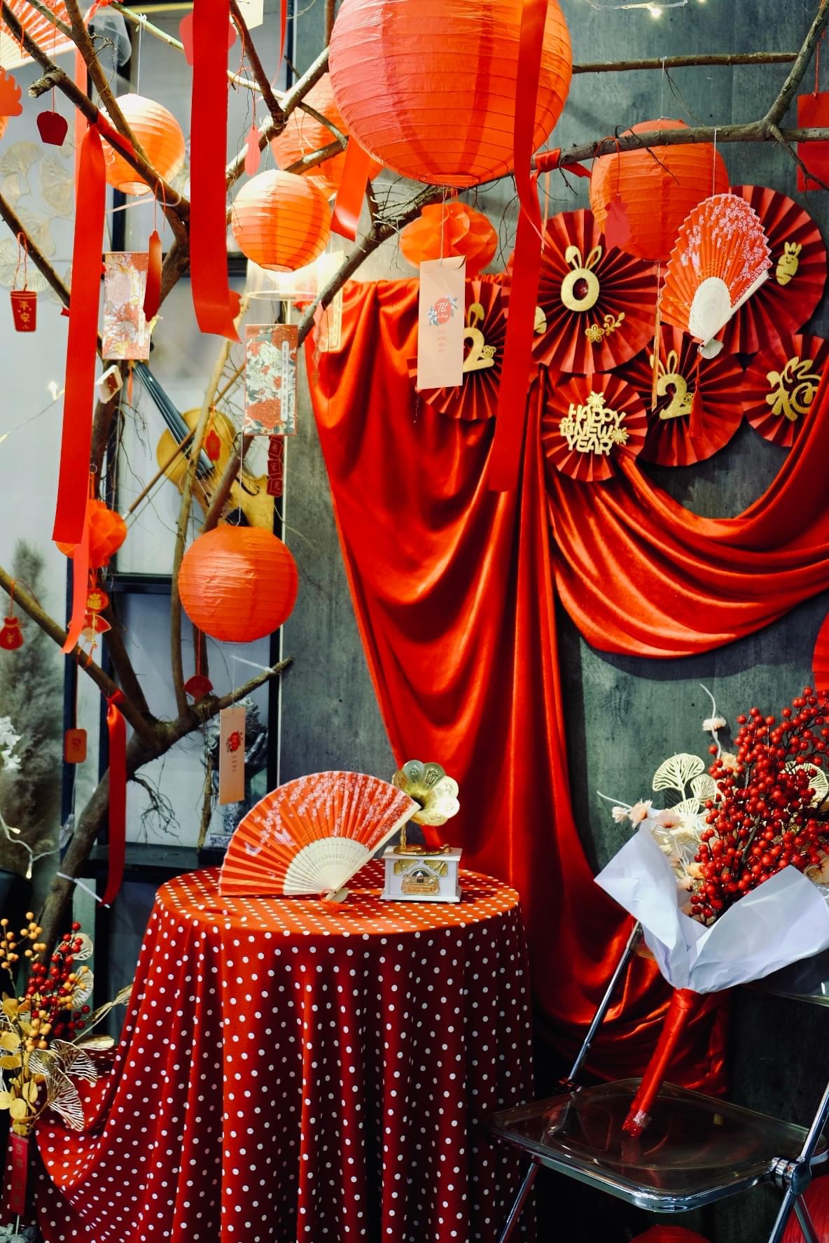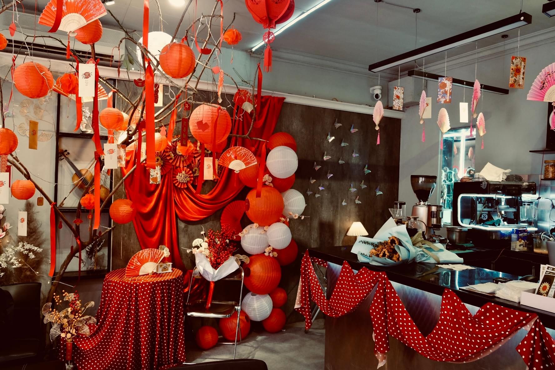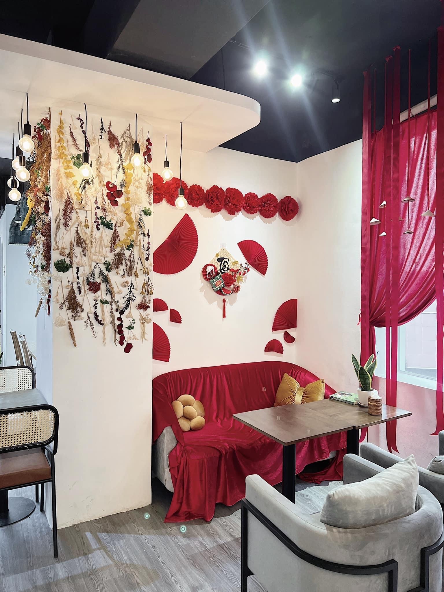 Để chào đón dịp Tết Nguyên đán, quán như khoác thêm áo mới với nhiều góc chụp hình đậm chất lễ hội. Tone đỏ ngự trị từ phông nền, dải pháo, quạt trang trí đan xen chậu cúc, cây lì xì là điểm nhấn gợi cảm hứng chụp hình cho khách ghé đến. Không chỉ chú trọng đến phần decor không gian mà đồ uống tại đây cũng được bài trí rất cầu kỳ càng tạo điểm nhấn hơn trong lòng thực khách.