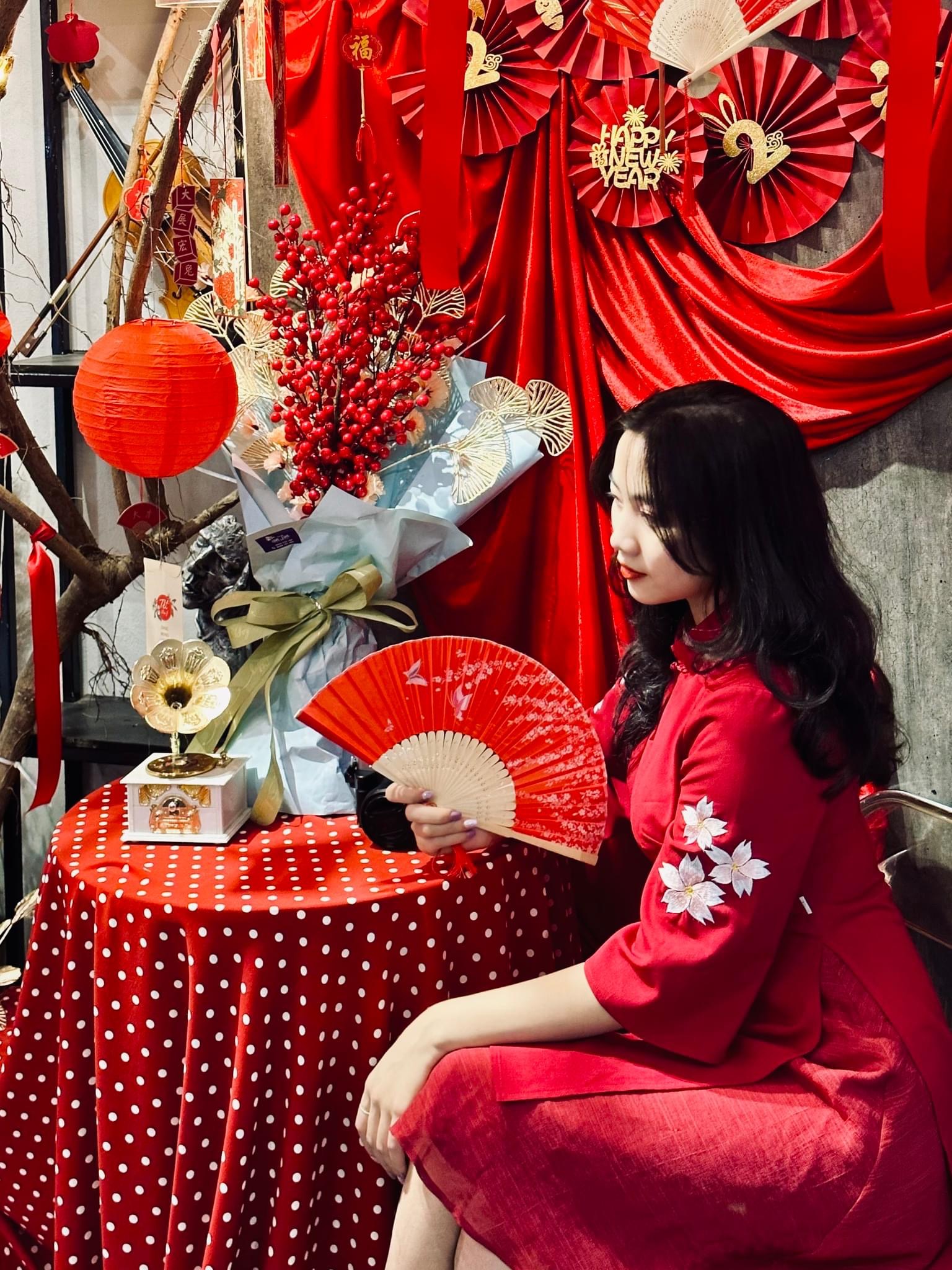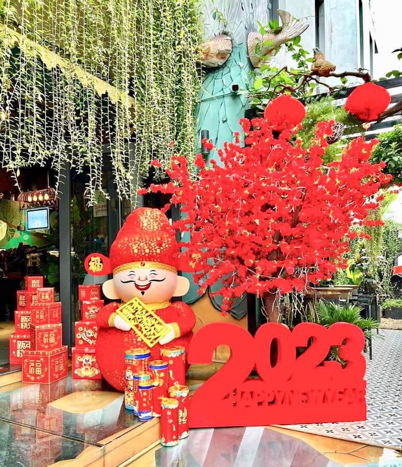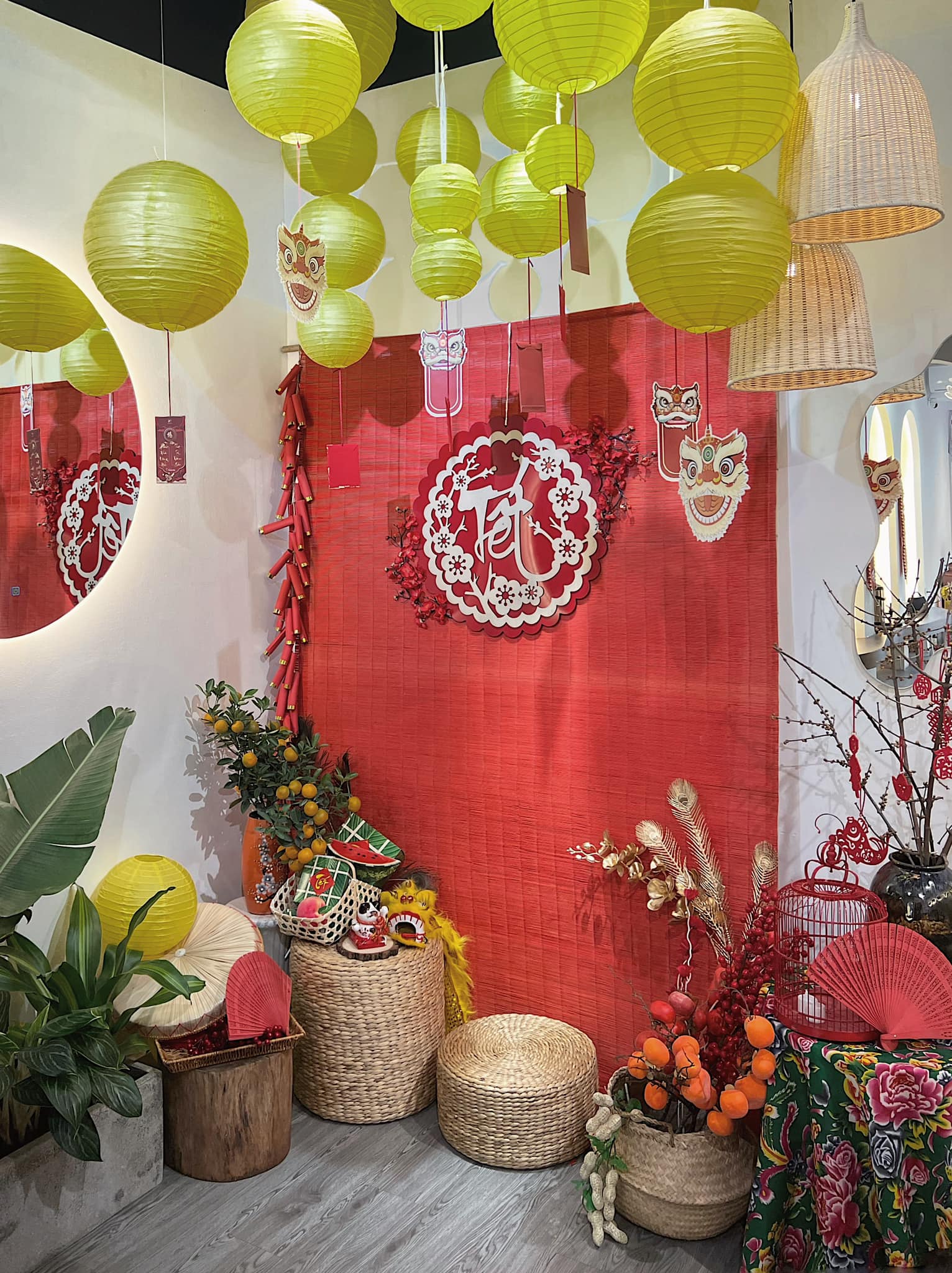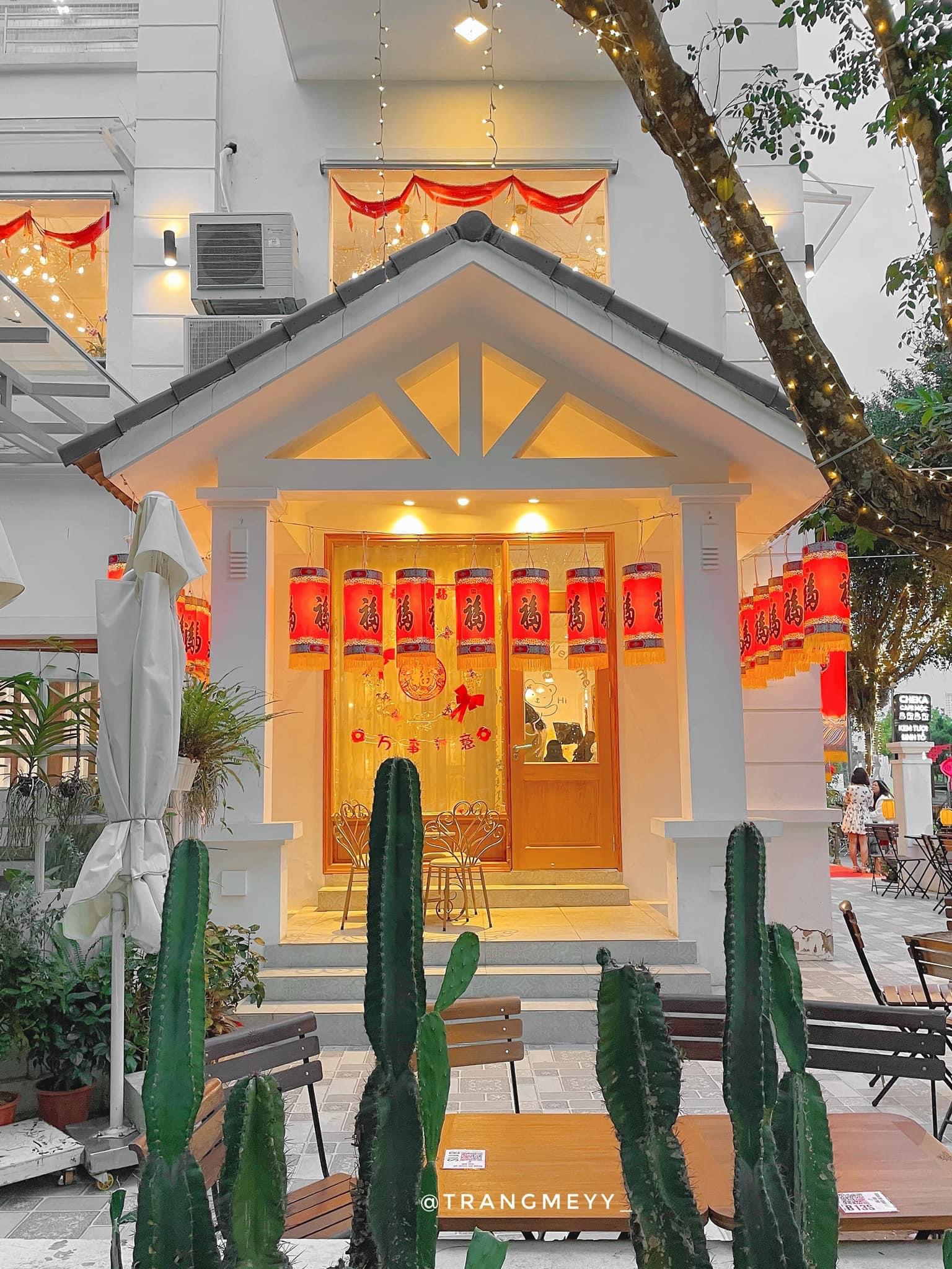 Để chào đón dịp Tết Nguyên đán, quán như khoác thêm áo mới với nhiều góc chụp hình đậm chất lễ hội. Tone đỏ ngự trị từ phông nền, dải pháo, quạt trang trí đan xen chậu cúc, cây lì xì là điểm nhấn gợi cảm hứng chụp hình cho khách ghé đến. Không chỉ chú trọng đến phần decor không gian mà đồ uống tại đây cũng được bài trí rất cầu kỳ càng tạo điểm nhấn hơn trong lòng thực khách.