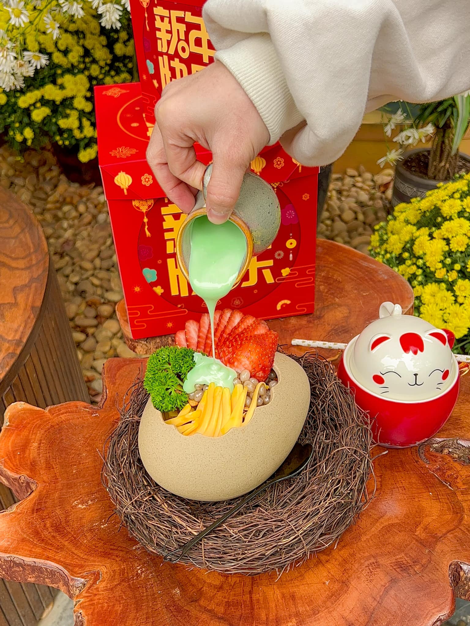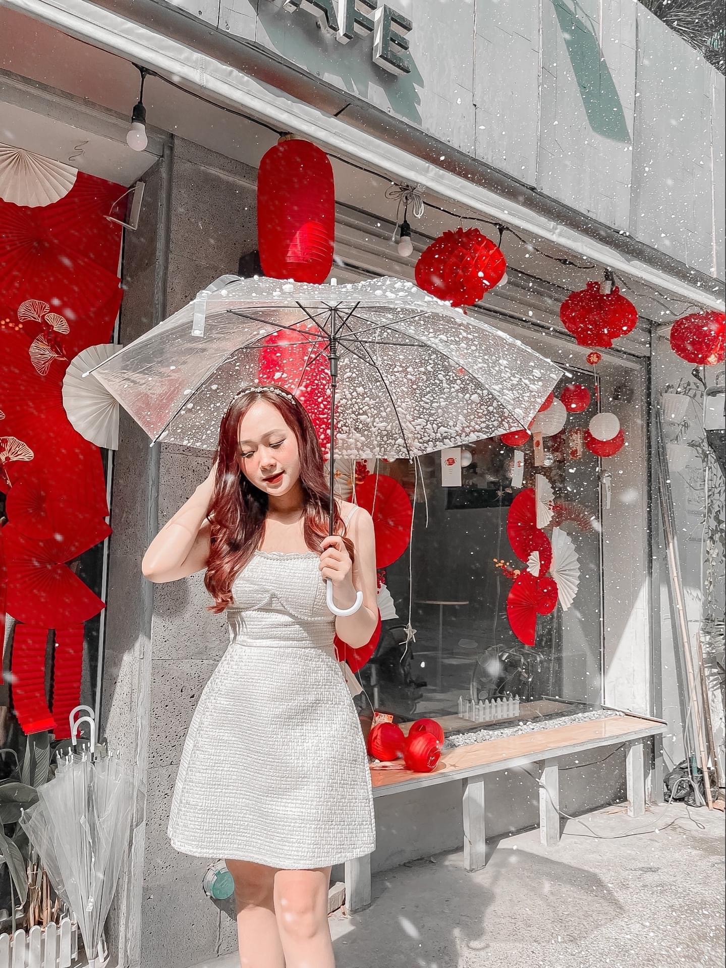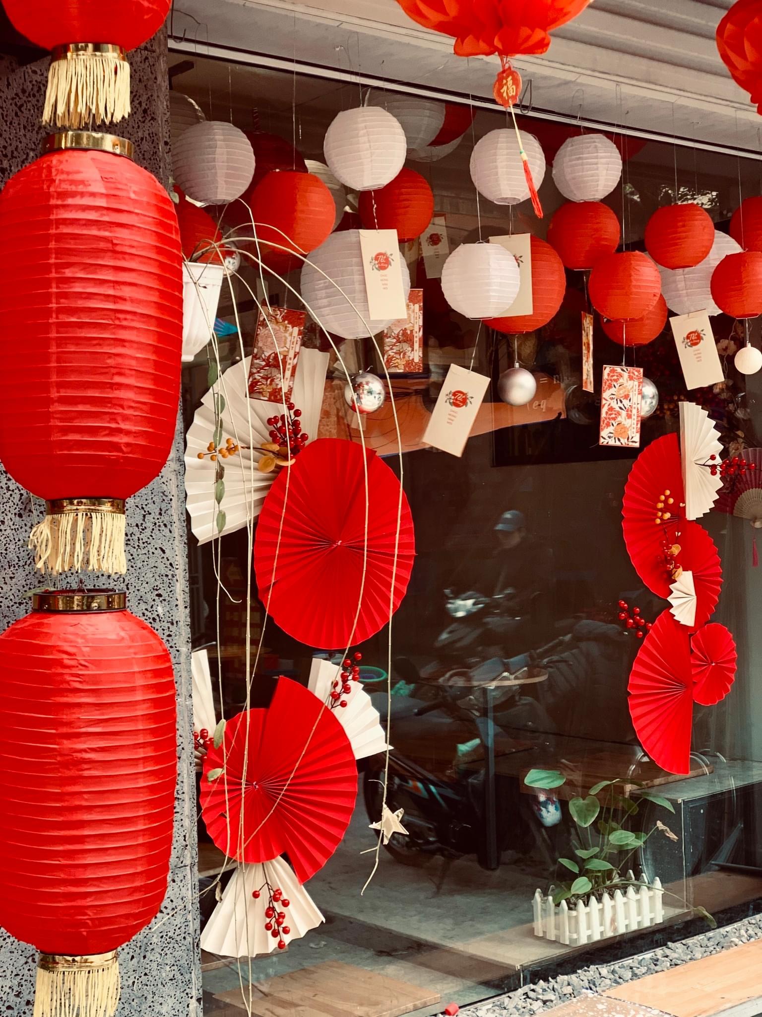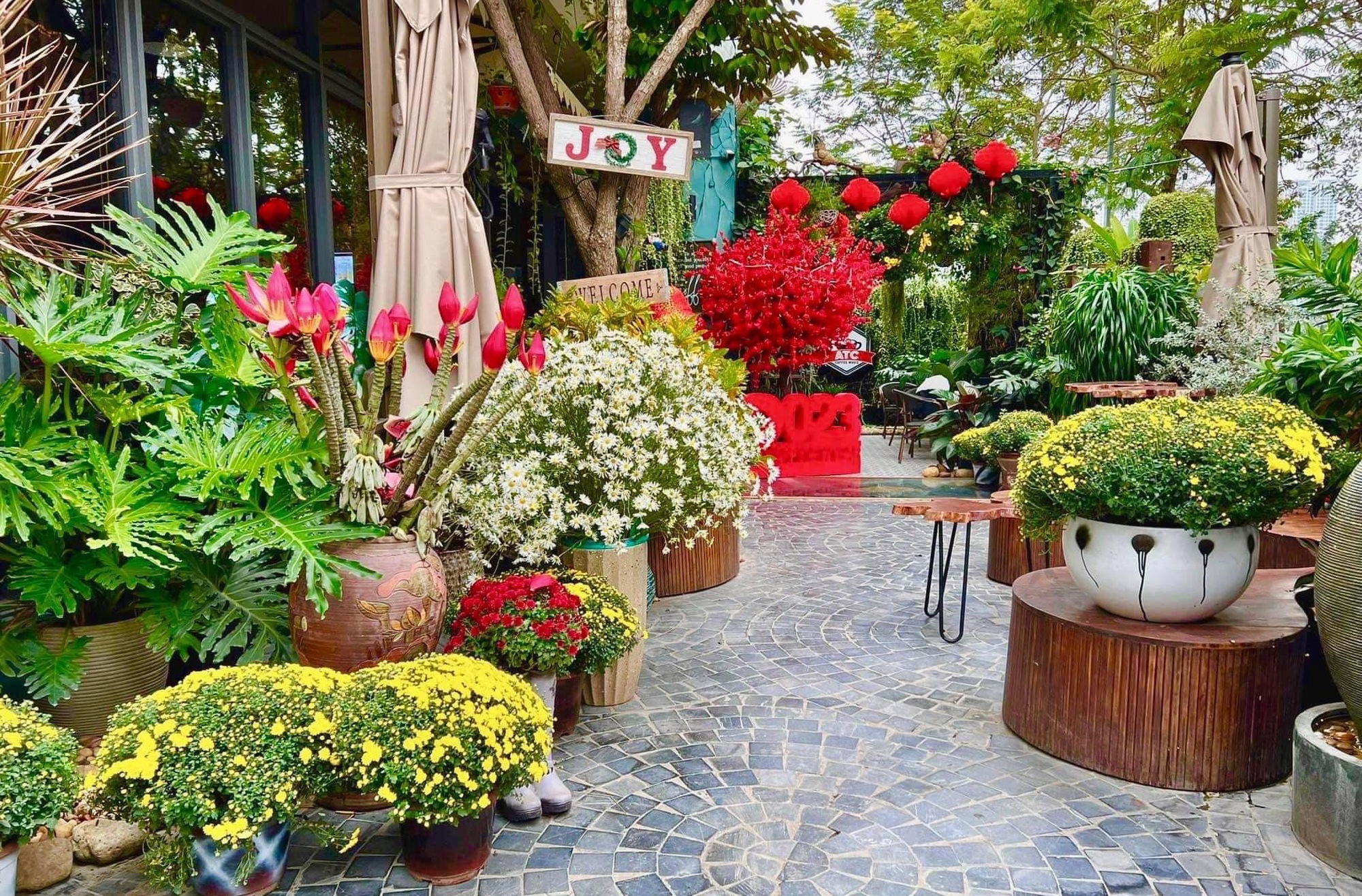 Để chào đón dịp Tết Nguyên đán, quán như khoác thêm áo mới với nhiều góc chụp hình đậm chất lễ hội. Tone đỏ ngự trị từ phông nền, dải pháo, quạt trang trí đan xen chậu cúc, cây lì xì là điểm nhấn gợi cảm hứng chụp hình cho khách ghé đến. Không chỉ chú trọng đến phần decor không gian mà đồ uống tại đây cũng được bài trí rất cầu kỳ càng tạo điểm nhấn hơn trong lòng thực khách.