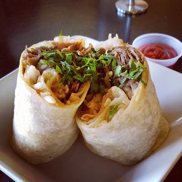 Phở burrito: Tưởng là họ hàng thân thiết với phở nhưng món biến tấu lạ lùng này trông giống bánh mì lai với phở cuốn hơn. Nó được bày bán ở nhiều nơi trên nước Mỹ, trong đó các nguyên liệu như thịt, giá đỗ, rau thơm, hành… được gói vào trong một chiếc bánh burrito rồi cuộn lại. Bánh được cắt đôi, một số quán phục vụ thêm một bát nước dùng cho thực khách