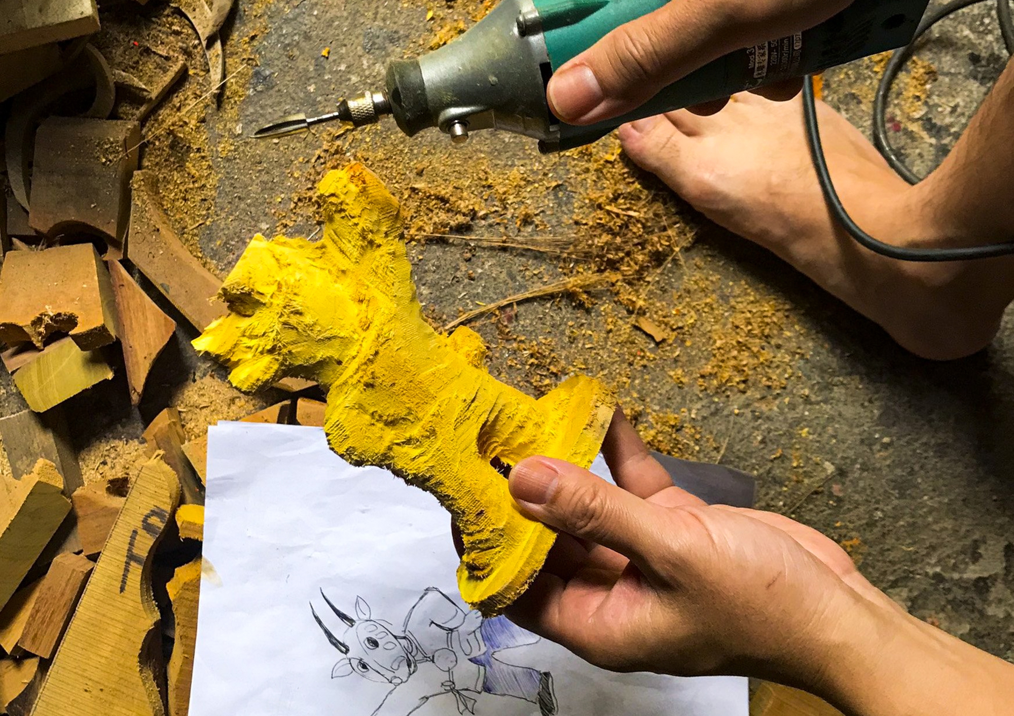 Đầu tiên, nghệ nhân phác thảo linh vật sao la trên giấy