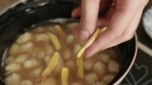 - Gừng thái nhỏ, cho vào nồi. Chú ý khuấy nhẹ, tránh làm nát sắn.
