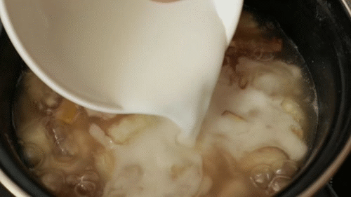 - Bột sắn dây hòa tan với nước, từ từ đổ vào nồi, khuấy nhẹ.