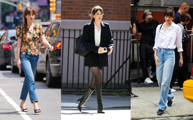 Thỉnh thoảng, Dakota Johnson cũng làm mới phong cách với quần jeans phối cùng những mẫu áo điệu đà như blouse hoa nhí tay phồng. Khi kết hợp với guốc cao gót, cô ưu tiên jeans ống đứng thay vì ống rộng để tạo độ ôm nhẹ, giúp vóc dáng trông gọn gàng và thanh thoát hơn