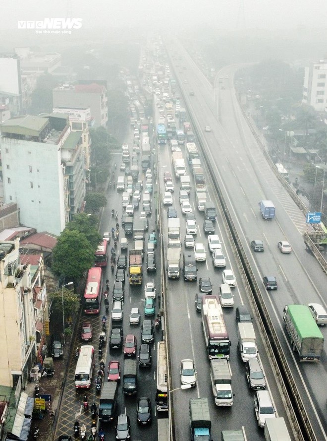 Từ 8h, trên nhiều tuyến đường như: Giải Phóng, Vành đai 3, Nguyễn Xiển... lượng phương tiện về các địa phương tăng đột biến. Trên tuyến đường Vành đai 3, đoạn ngã tư Linh Đàm, dòng xe nối đuôi nhau khoảng 500 m. Loạt xe máy lách qua những khe hở giữa ô tô để tìm cách thoát ra khỏi đoạn ùn tắc.