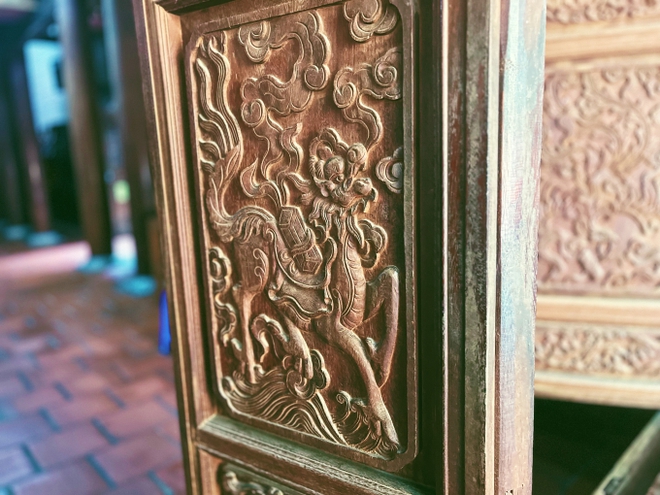 Phía trước hồi nhà xây theo kiểu trụ lồng đèn, đỉnh trụ đắp hình chim phượng, còn phần lồng đen đắp tứ linh, gờ nổi ở thân trụ được đắp câu đối chữ Hán. Hai gian hồi cũng được trang trí chủ đề cúc và tùng.