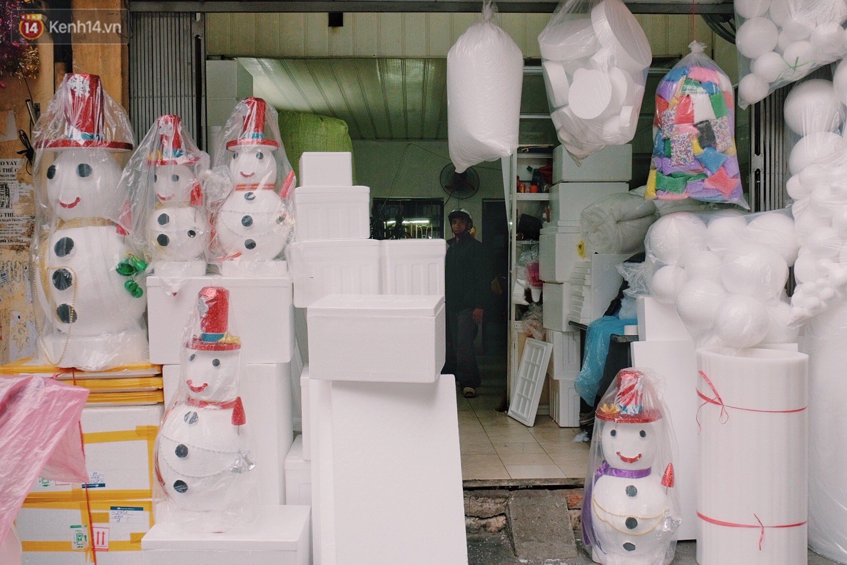 Dọc tuyến phố Hàng Mã hầu như cửa hàng nào cũng trưng bày nhiều ông già tuyết được làm bằng xốp như thế này.