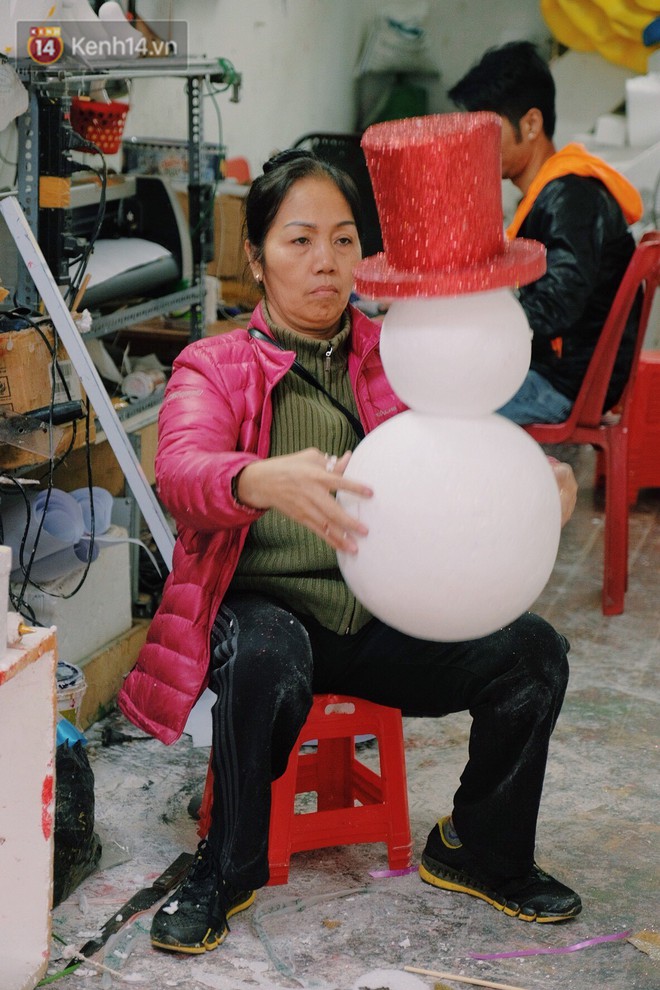 Thông thường để làm một ông già tuyết, người thợ phải bắt đầu từ việc gọt, tạo hình, mài nhẵn, phủ sơn và "đeo" kim tuyến cho các sản phẩm. Người tuyết được thiết kế với đủ chiều cao từ 60cm - 80cm, thậm chí có con cao hơn cả đầu người lớn.