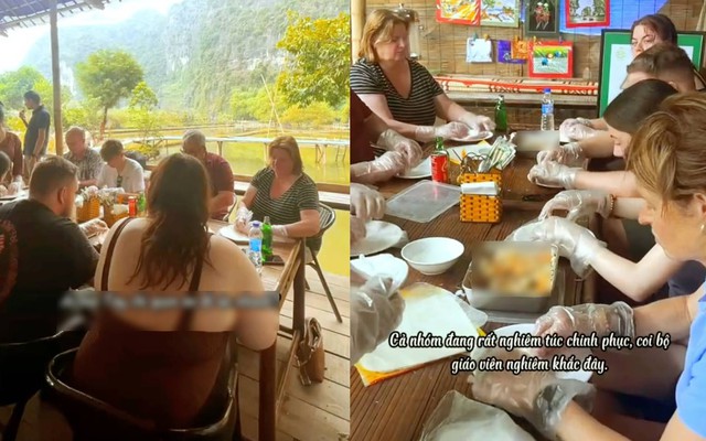 Được biết, bên cạnh chuẩn bị nguyên liệu để các du khách Tây cuốn nem, khu du lịch Hang Trâu này còn có các nhân viên với vai trò hướng dẫn cho các du khách khi làm món ăn. Thế nên dù là lớp học nhưng vô cùng thú vị.
