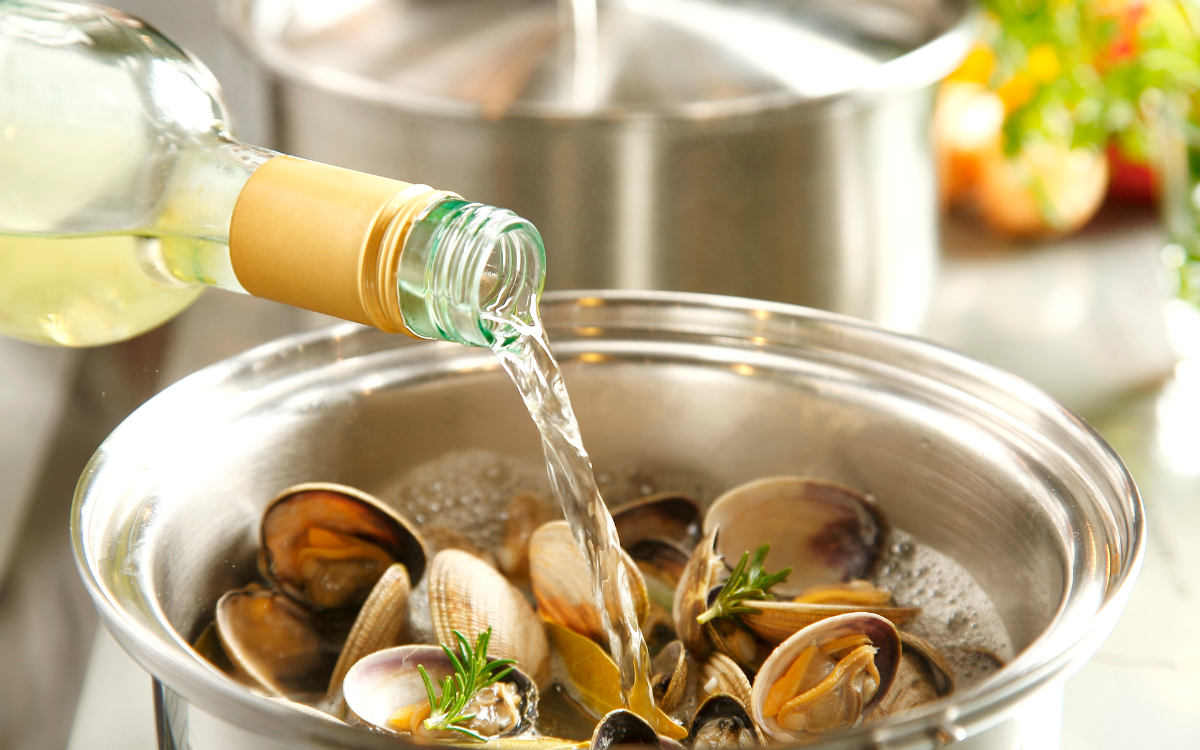 Rượu vang trắng hợp với hải sản như tôm, cua, nghêu, sò, ốc,... Khi nấu ăn cho rượu vang trắng khoảng 6 phút thì tắt bếp để hương thơm và vị rượu còn đậm đà.