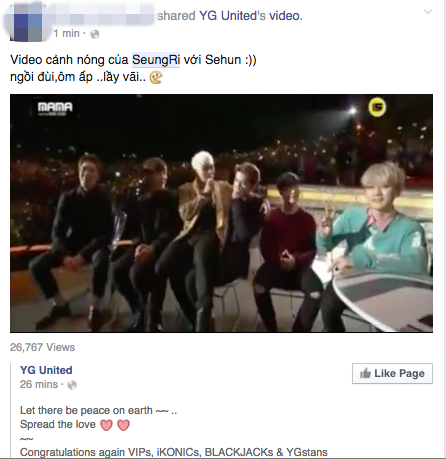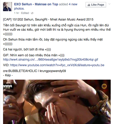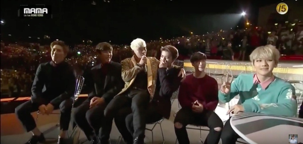 Cho đến giờ những dấu ấn đặc biệt của lễ trao giải MAMA 2015 vẫn đang được cư dân mạng "lùng sục" suốt nhiều giờ qua. Đặc biệt, một khoảnh khắc hiếm hoi có liên hệ tới hai nhóm nhạc nam đình đám nhất hiện nay EXO và Big Bang đang khiến cộng đồng mạng "rần rần" thích thú. Cụ thể trong phần biểu diễn ca khúc "Bae Bae", thành viên Seungri đã tiến đến khu vực ngồi chờ của EXO, không ngần ngại ngồi lên đùi em út Sehun và liên tục dành những cử chỉ thân mật cho hậu bối.