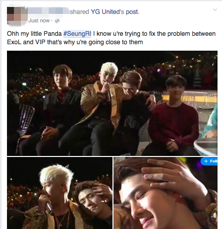 Seungri ngồi lên đùi của Sehun rất tự nhiên và thoải mái. Nhiều fan gán ghép hai thần tượng với nhau thành cặp đôi em út của hai nhóm nhạc đình đám